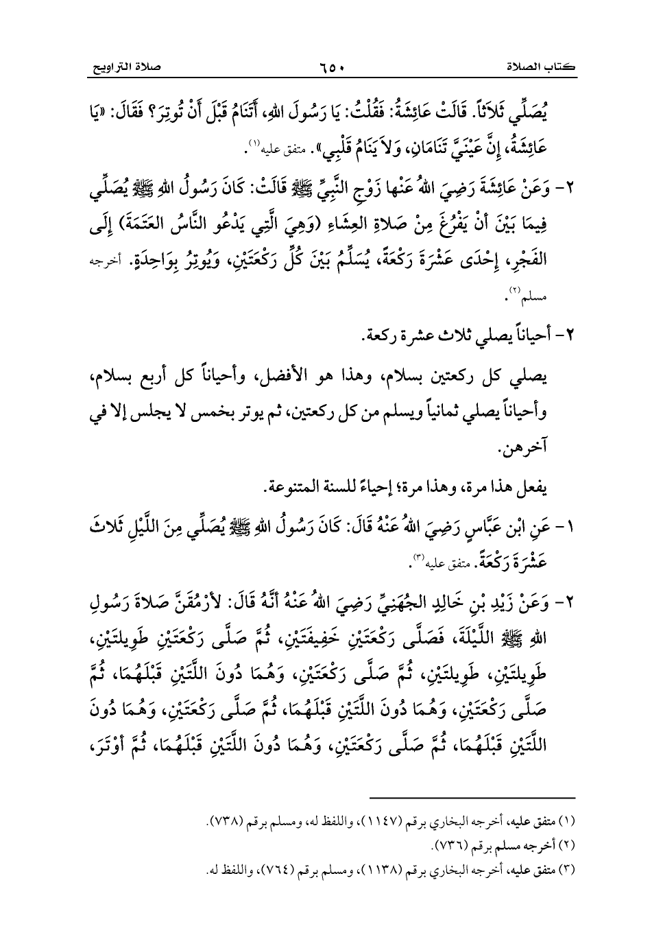 1 - عَنِ ابْن عَبَّاسٍ رَضِيَ اللهُ عَنْهُ قَالَ: كَانَ رَسُولُ اللهِ - صلى الله عليه وسلم - يُصَلِّي مِنَ اللَّيْلِ ثَلاثَ عَشْرَةَ رَكْعَةً. متفق عليه (¬3).