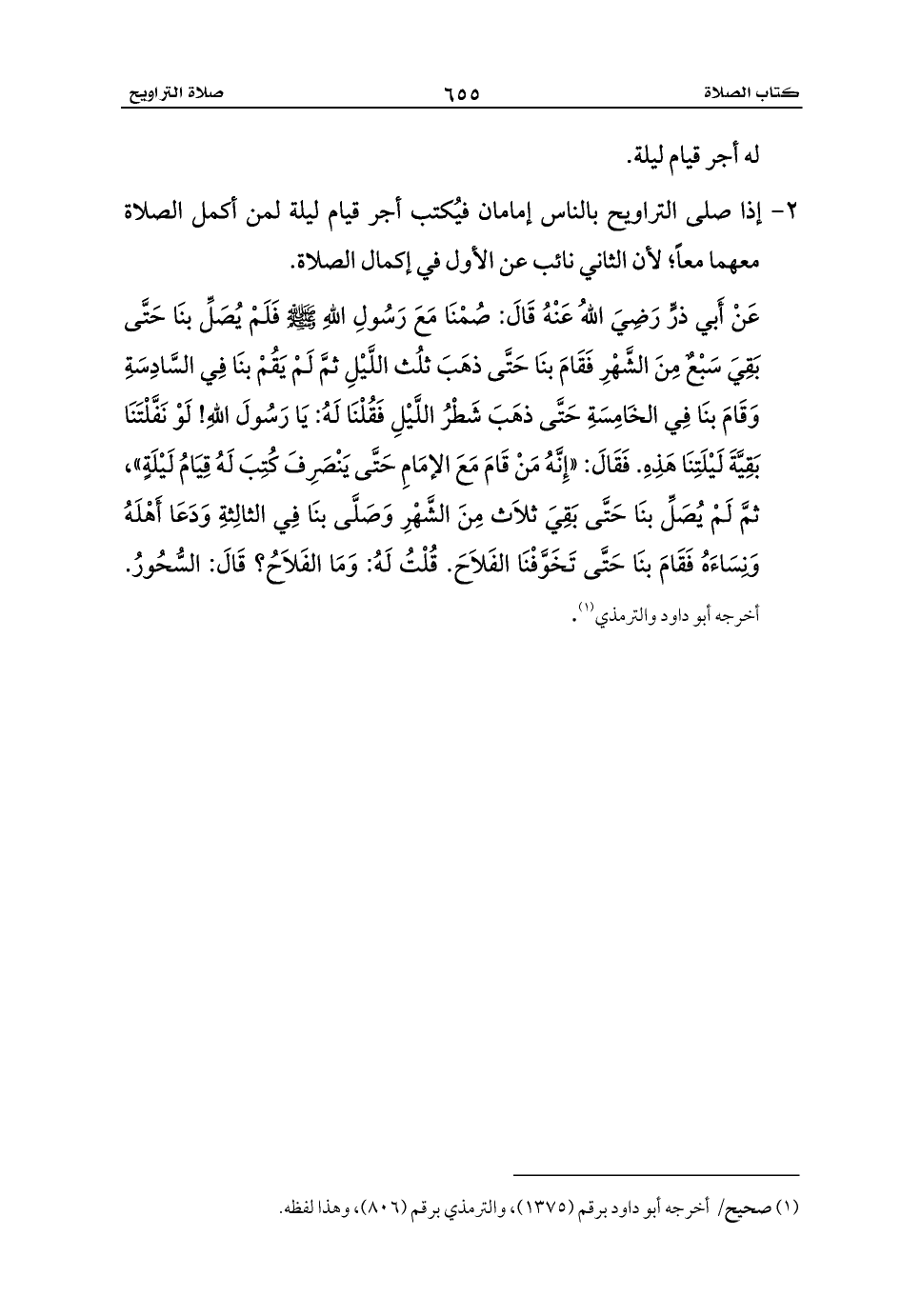 عَنْ أَبي ذرٍّ رَضِيَ اللهُ عَنْهُ قَالَ: صُمْنَا مَعَ رَسُولِ اللهِ - صلى الله عليه وسلم - فَلَمْ يُصَلِّ بنَا حَتَّى بَقِيَ سَبْعٌ مِنَ الشَّهْرِ فَقَامَ بنَا حَتَّى ذهَبَ ثلُث اللَّيْلِ ثمَّ لَمْ يَقُمْ بنَا فِي السَّادِسَةِ وَقَامَ بنَا فِي الخَامِسَةِ حَتَّى ذهَبَ شَطْرُ اللَّيْلِ فَقُلْنَا لَهُ: يَا رَسُولَ اللهِ! لَوْ نَفَّلْتَنَا بَقِيَّةَ لَيْلَتِنَا هَذِهِ. فَقَالَ: «إِنَّهُ مَنْ قَامَ مَعَ الإمَامِ حَتَّى يَنْصَرِفَ كُتِبَ لَهُ قِيَامُ لَيْلَةٍ»، ثمَّ لَمْ يُصَلِّ بنَا حَتَّى بَقِيَ ثلاَث مِنَ الشَّهْرِ وَصَلَّى بنَا فِي الثالِثةِ وَدَعَا أَهْلَهُ وَنِسَاءَهُ فَقَامَ بنَا حَتَّى تَخَوَّفْنَا الفَلاَحَ. قُلْتُ لَهُ: وَمَا الفَلاَحُ؟ قَالَ: السُّحُورُ. أخرجه أبو داود والترمذي (¬1).