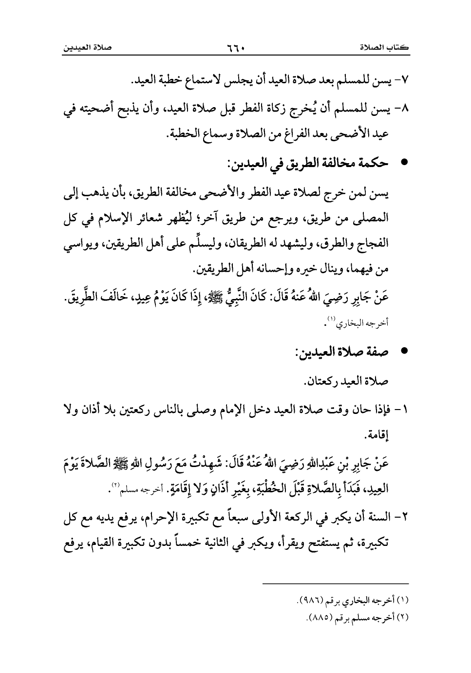 عَنْ جَابِرِ رَضِيَ اللهُ عَنهُ قَالَ: كَانَ النَّبِيُّ - صلى الله عليه وسلم -، إِذَا كَانَ يَوْمُ عِيدٍ، خَالَفَ الطَّرِيقَ. أخرجه البخاري (¬1).