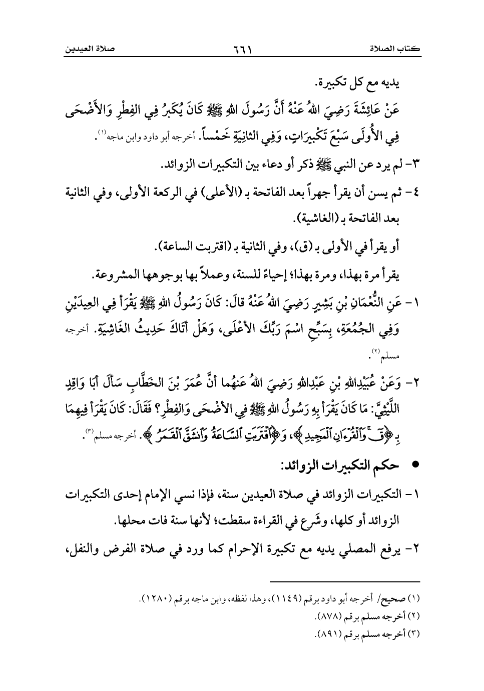 عَنْ عَائِشَةَ رَضِيَ اللهُ عَنْهُ أَنَّ رَسُولَ اللهِ - صلى الله عليه وسلم - كَانَ يُكَبرُ فِي الفِطْرِ وَالأَضْحَى فِي الأُولَى سَبْعَ تَكْبيرَاتٍ، وَفِي الثانِيَةِ خَمْساً. أخرجه أبو داود وابن ماجه (¬1).
