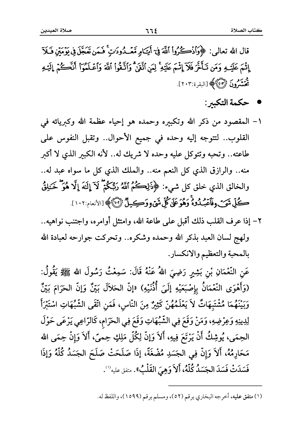 عَنِ النّعْمَانِ بْنِ بَشِيرٍ رَضِيَ اللهُ عَنْهُ قَالَ: سَمِعْتُ رَسُولَ الله - صلى الله عليه وسلم - يَقُولُ: (وَأَهْوَى النّعْمَانُ بِإِصْبَعَيْهِ إلَىَ أُذُنَيْهِ) «إنّ الحَلاَلَ بَيّنٌ وَإنّ الحَرَامَ بَيّنٌ وَبَيْنَهُمَا مُشْتَبِهَاتٌ لاَ يَعْلَمُهُنّ كَثِيرٌ مِنَ النّاسِ، فَمَنِ اتّقَى الشّبُهَاتِ اسْتَبْرَأَ لِدِينِهِ وَعِرْضِهِ، وَمَنْ وَقَعَ فِي الشّبُهَاتِ وَقَعَ فِي الحَرَامِ، كَالرّاعِي يَرْعَى حَوْلَ الحِمَى، يُوشِكُ أَنْ يَرْتَعَ فِيهِ، أَلاَ وَإنّ لِكُلّ مَلِكٍ حِمىً، أَلاَ وَإِنّ حِمَى الله مَحَارِمُهُ، أَلاَ وَإِنّ فِي الجَسَدِ مُضْغَةً، إذَا صَلَحَتْ صَلَحَ الجَسَدُ كُلّهُ وَإذَا فَسَدَتْ فَسَدَ الجَسَدُ كُلّهُ، أَلاَ وَهِيَ القَلْبُ». متفق عليه (¬1).