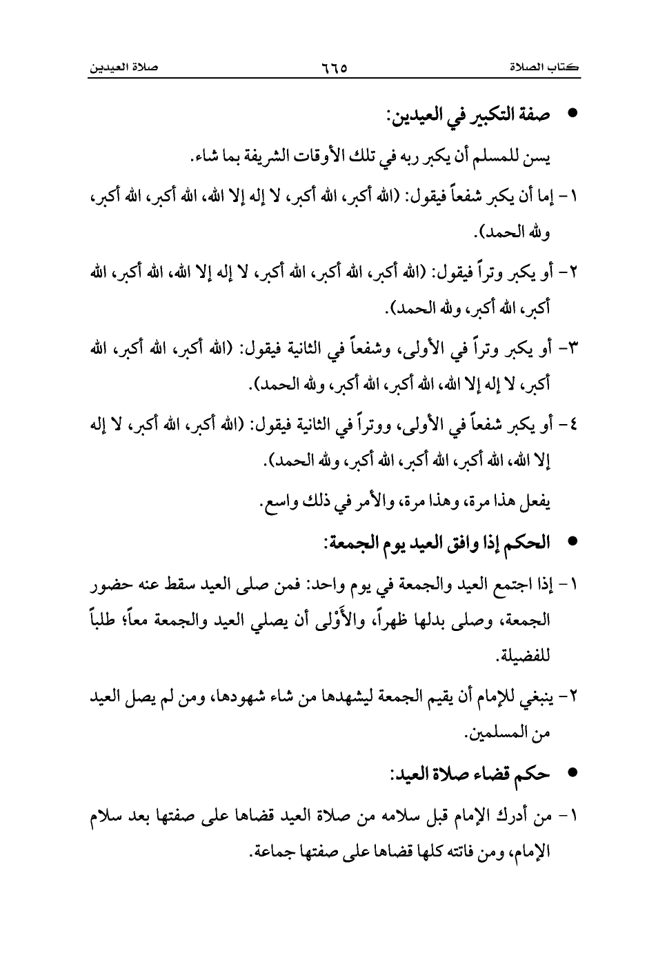 1 - من أدرك الإمام قبل سلامه من صلاة العيد قضاها على صفتها بعد سلام الإمام، ومن فاتته كلها قضاها على صفتها جماعة.