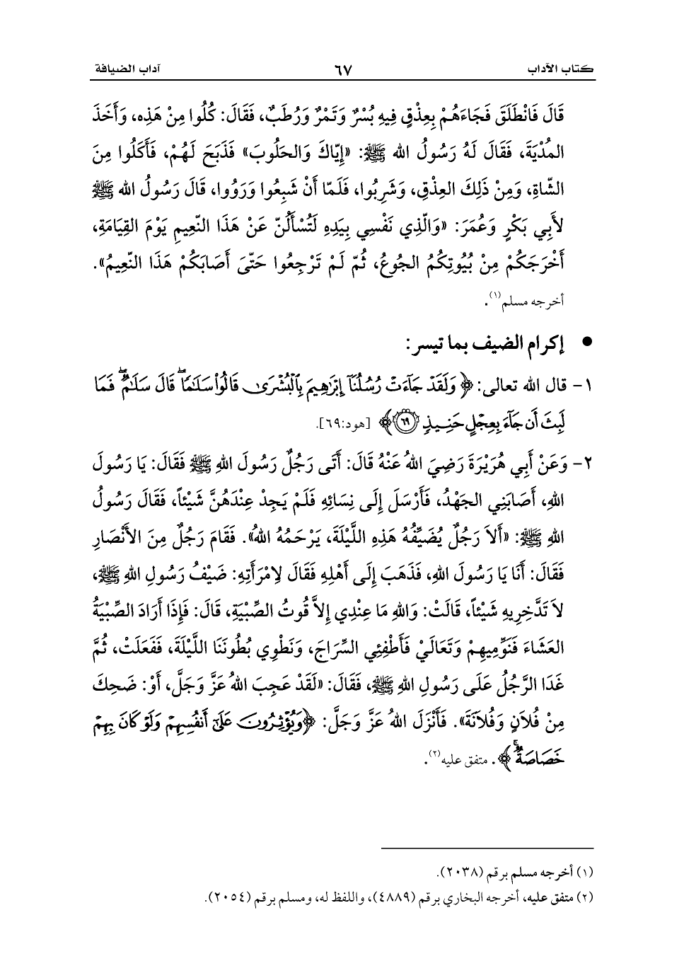 2 - وَعَنْ أَبِي هُرَيْرَةَ رَضِيَ اللهُ عَنْهُ قَالَ: أَتَى رَجُلٌ رَسُولَ اللهِ - صلى الله عليه وسلم - فَقَالَ: يَا رَسُولَ اللهِ، أَصَابَنِي الجَهْدُ، فَأَرْسَلَ إِلَى نِسَائِهِ فَلَمْ يَجِدْ عِنْدَهُنَّ شَيْئاً، فَقَالَ رَسُولُ اللهِ - صلى الله عليه وسلم -: «أَلاَ رَجُلٌ يُضَيِّفُهُ هَذِهِ اللَّيْلَةَ، يَرْحَمُهُ اللهُ». فَقَامَ رَجُلٌ مِنَ الأَنْصَارِ فَقَالَ: أَنَا يَا رَسُولَ اللهِ، فَذَهَبَ إِلَى أَهْلِهِ فَقَالَ لاِمْرَأَتِهِ: ضَيْفُ رَسُولِ اللهِ - صلى الله عليه وسلم -، لاَ تَدَّخِرِيهِ شَيْئاً، قَالَتْ: وَاللهِ مَا عِنْدِي إِلاَّ قُوتُ الصِّبْيَةِ، قَالَ: فَإِذَا أَرَادَ الصِّبْيَةُ العَشَاءَ فَنَوِّمِيهِمْ وَتَعَالَيْ فَأَطْفِئِي السِّرَاجَ، وَنَطْوِي بُطُونَنَا اللَّيْلَةَ، فَفَعَلَتْ، ثُمَّ غَدَا الرَّجُلُ عَلَى رَسُولِ اللهِ - صلى الله عليه وسلم -، فَقَالَ: «لَقَدْ عَجِبَ اللهُ عَزَّ وَجَلَّ، أَوْ: ضَحِكَ مِنْ فُلاَنٍ وَفُلاَنَةَ». فَأَنْزَلَ اللهُ عَزَّ وَجَلَّ: {وَيُؤْثِرُونَ عَلَى أَنْفُسِهِمْ وَلَوْ كَانَ بِهِمْ