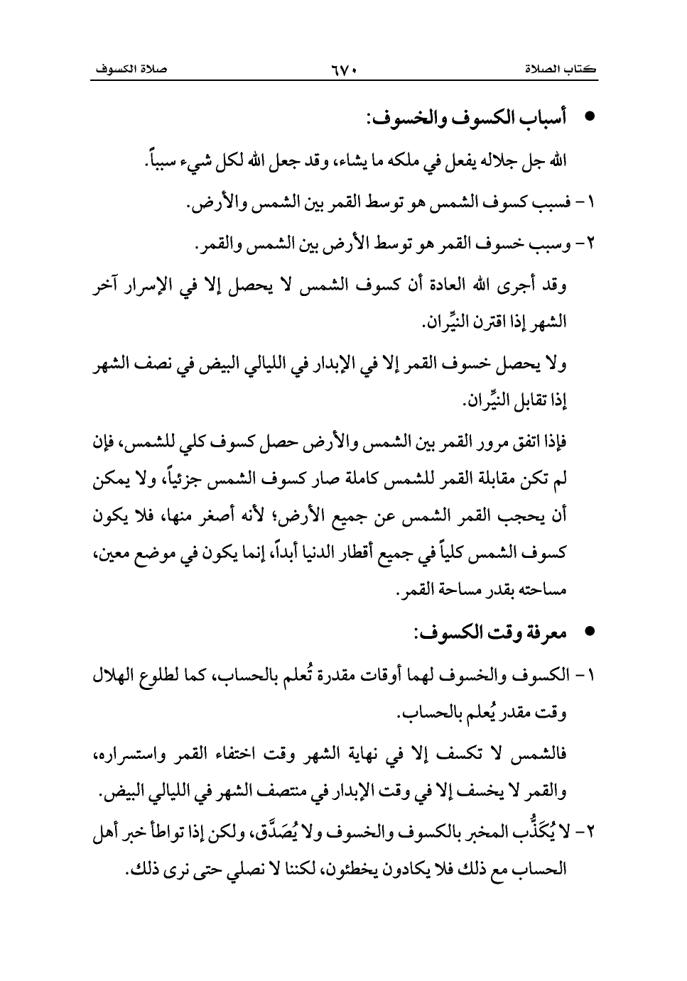 1 - الكسوف والخسوف لهما أوقات مقدرة تُعلم بالحساب، كما لطلوع الهلال وقت مقدر يُعلم بالحساب.