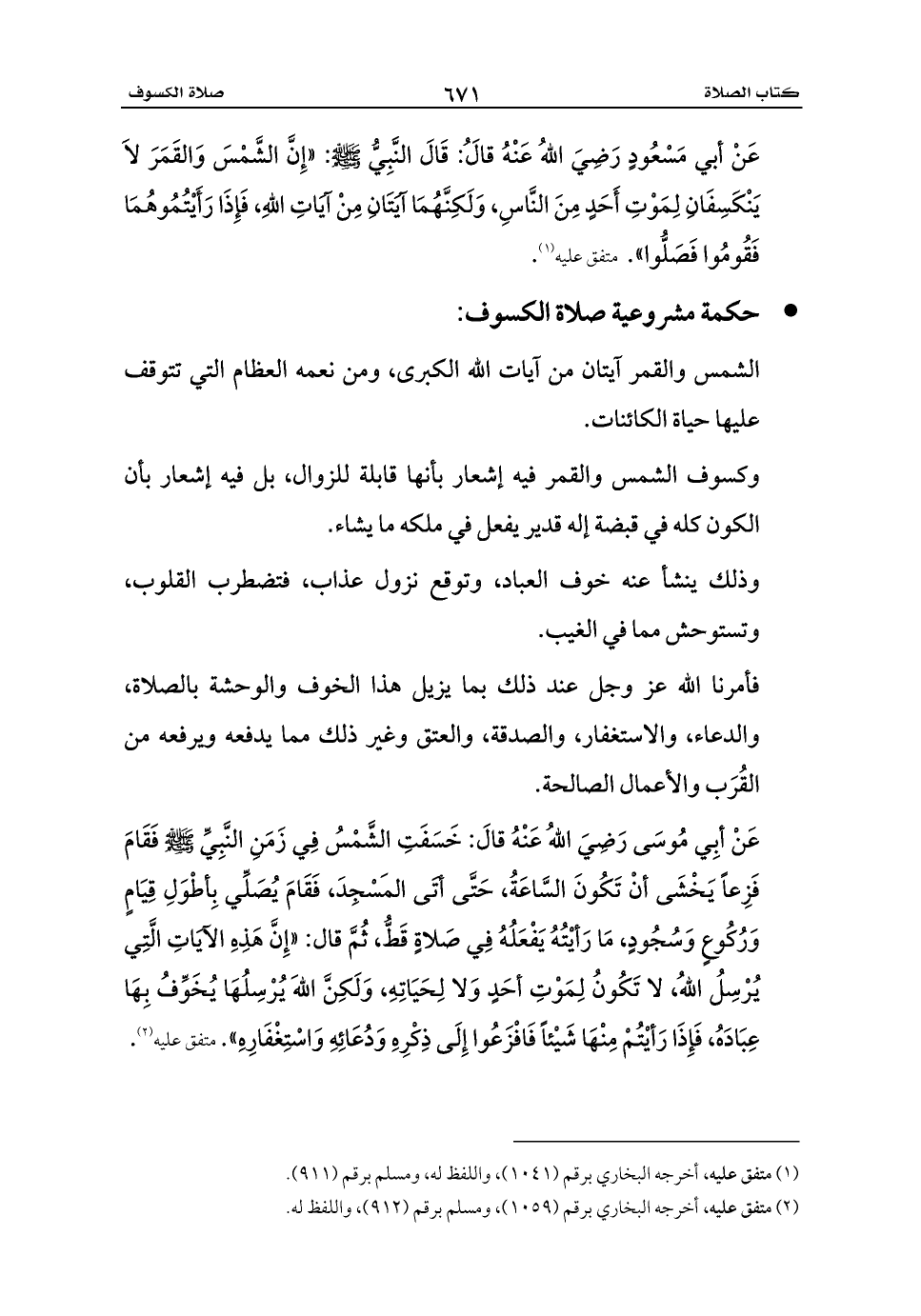 عَنْ أبِي مُوسَى رَضِيَ اللهُ عَنْهُ قالَ: خَسَفَتِ الشَّمْسُ فِي زَمَنِ النَّبِيِّ - صلى الله عليه وسلم - فَقَامَ فَزِعاً يَخْشَى أنْ تَكُونَ السَّاعَةُ، حَتَّى أتَى المَسْجِدَ، فَقَامَ يُصَلِّي بِأطْوَلِ قِيَامٍ وَرُكُوعٍ وَسُجُودٍ، مَا رَأيْتُهُ يَفْعَلُهُ فِي صَلاةٍ قَطُّ، ثُمَّ قال: «إِنَّ هَذِهِ الآيَاتِ الَّتِي يُرْسِلُ اللهُ، لا تَكُونُ لِمَوْتِ أحَدٍ وَلا لِحَيَاتِهِ، وَلَكِنَّ اللهَ يُرْسِلُهَا يُخَوِّفُ بِهَا عِبَادَهُ، فَإِذَا رَأيْتُمْ مِنْهَا شَيْئاً فَافْزَعُوا إِلَى ذِكْرِهِ وَدُعَائِهِ وَاسْتِغْفَارِهِ». متفق عليه (¬2).