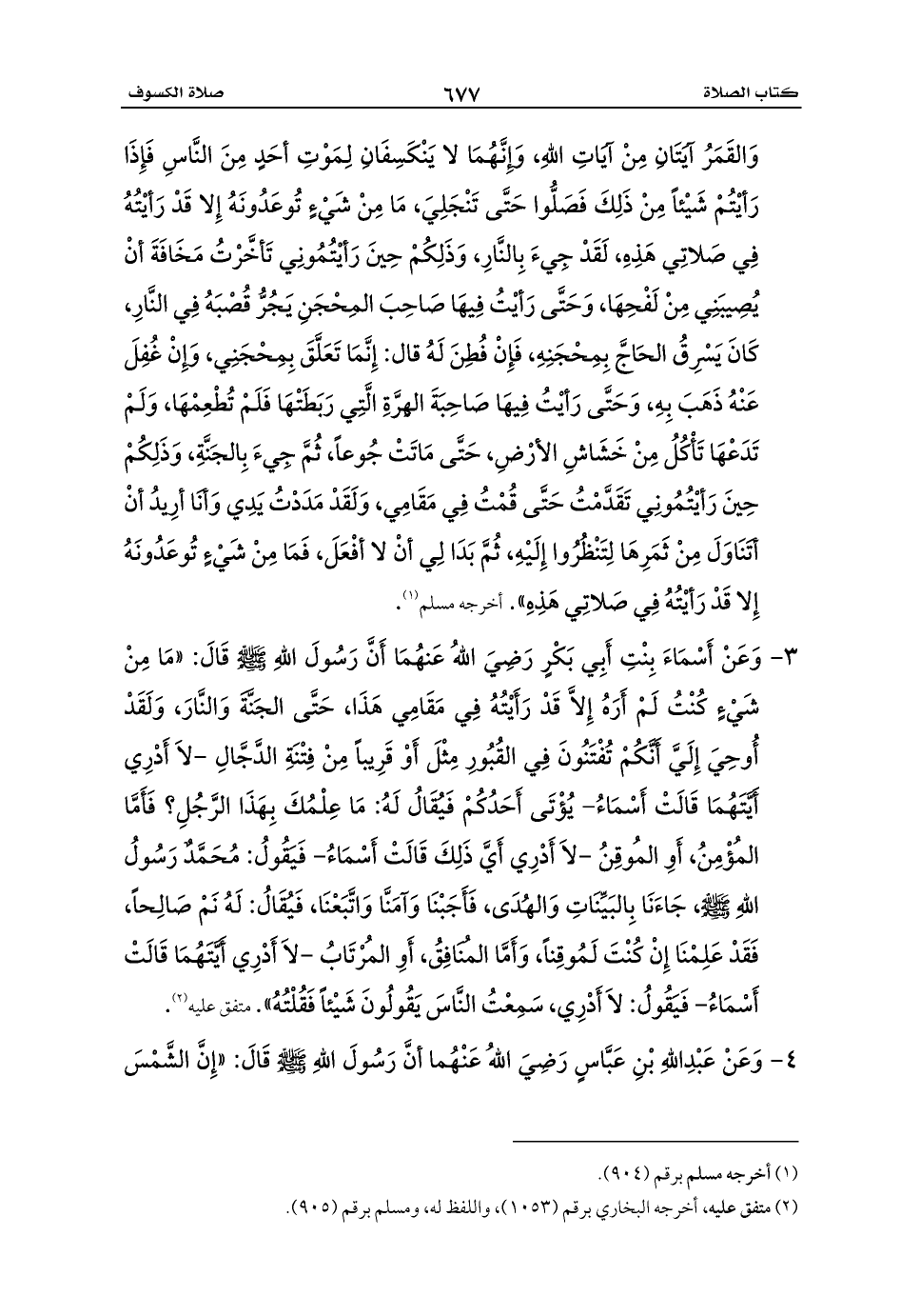 وَالقَمَرُ آيَتَانِ مِنْ آيَاتِ اللهِ، وَإِنَّهُمَا لا يَنْكَسِفَانِ لِمَوْتِ أحَدٍ مِنَ النَّاسِ فَإِذَا رَأيْتُمْ شَيْئاً مِنْ ذَلِكَ فَصَلُّوا حَتَّى تَنْجَلِيَ، مَا مِنْ شَيْءٍ تُوعَدُونَهُ إِلا قَدْ رَأيْتُهُ فِي صَلاتِي هَذِهِ، لَقَدْ جِيءَ بِالنَّارِ، وَذَلِكُمْ حِينَ رَأيْتُمُونِي تَأخَّرْتُ مَخَافَةَ أنْ يُصِيبَنِي مِنْ لَفْحِهَا، وَحَتَّى رَأيْتُ فِيهَا صَاحِبَ المِحْجَنِ يَجُرُّ قُصْبَهُ فِي النَّارِ، كَانَ يَسْرِقُ الحَاجَّ بِمِحْجَنِهِ، فَإِنْ فُطِنَ لَهُ قال: إِنَّمَا تَعَلَّقَ بِمِحْجَنِي، وَإِنْ غُفِلَ عَنْهُ ذَهَبَ بِهِ، وَحَتَّى رَأيْتُ فِيهَا صَاحِبَةَ الهِرَّةِ الَّتِي رَبَطَتْهَا فَلَمْ تُطْعِمْهَا، وَلَمْ تَدَعْهَا تَأْكُلُ مِنْ خَشَاشِ الأرْضِ، حَتَّى مَاتَتْ جُوعاً، ثُمَّ جِيءَ بِالجَنَّةِ، وَذَلِكُمْ حِينَ رَأيْتُمُونِي تَقَدَّمْتُ حَتَّى قُمْتُ فِي مَقَامِي، وَلَقَدْ مَدَدْتُ يَدِي وَأنَا أرِيدُ أنْ أتَنَاوَلَ مِنْ ثَمَرِهَا لِتَنْظُرُوا إِلَيْهِ، ثُمَّ بَدَا لِي أنْ لا أفْعَلَ، فَمَا مِنْ شَيْءٍ تُوعَدُونَهُ إِلا قَدْ رَأيْتُهُ فِي صَلاتِي هَذِهِ». أخرجه مسلم (¬1).