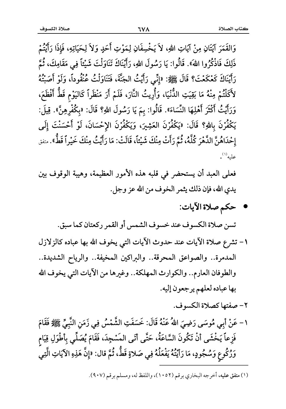 1 - عَنْ أبِي مُوسَى رَضِيَ اللهُ عَنْهُ قَالَ: خَسَفَتِ الشَّمْسُ فِي زَمَنِ النَّبِيِّ - صلى الله عليه وسلم - فَقَامَ فَزِعاً يَخْشَى أنْ تَكُونَ السَّاعَةُ، حَتَّى أتَى المَسْجِدَ، فَقَامَ يُصَلِّي بِأطْوَلِ قِيَامٍ