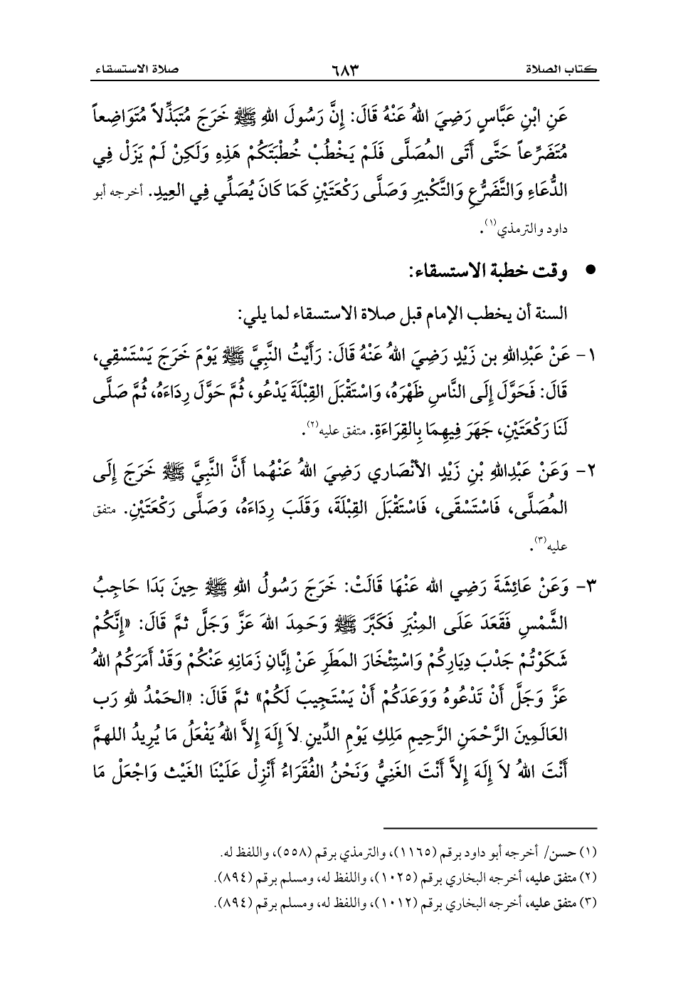 3 - وَعَنْ عَائِشَةَ رَضِي الله عَنْهَا قَالَتْ: خَرَجَ رَسُولُ اللهِ - صلى الله عليه وسلم - حِينَ بَدَا حَاجِبُ الشَّمْسِ فَقَعَدَ عَلَى المِنْبَرِ فَكَبَّرَ - صلى الله عليه وسلم - وَحَمِدَ اللهَ عَزَّ وَجَلَّ ثمَّ قَالَ: «إِنَّكُمْ شَكَوْتُمْ جَدْبَ دِيَارِكُمْ وَاسْتِئْخَارَ المَطَرِ عَنْ إِبَّانِ زَمَانِهِ عَنْكُمْ وَقَدْ أَمَرَكُمُ اللهُ عَزَّ وَجَلَّ أَنْ تَدْعُوهُ وَوَعَدَكُمْ أَنْ يَسْتَجِيبَ لَكُمْ» ثمَّ قَالَ: ? «الحَمْدُ للهِ رَب العَالَمِينَ الرَّحْمَنِ الرَّحِيمِ مَلِكِ يَوْمِ الدِّينِ لاَ إِلَهَ إِلاَّ اللهُ يَفْعَلُ مَا يُرِيدُ اللهمَّ