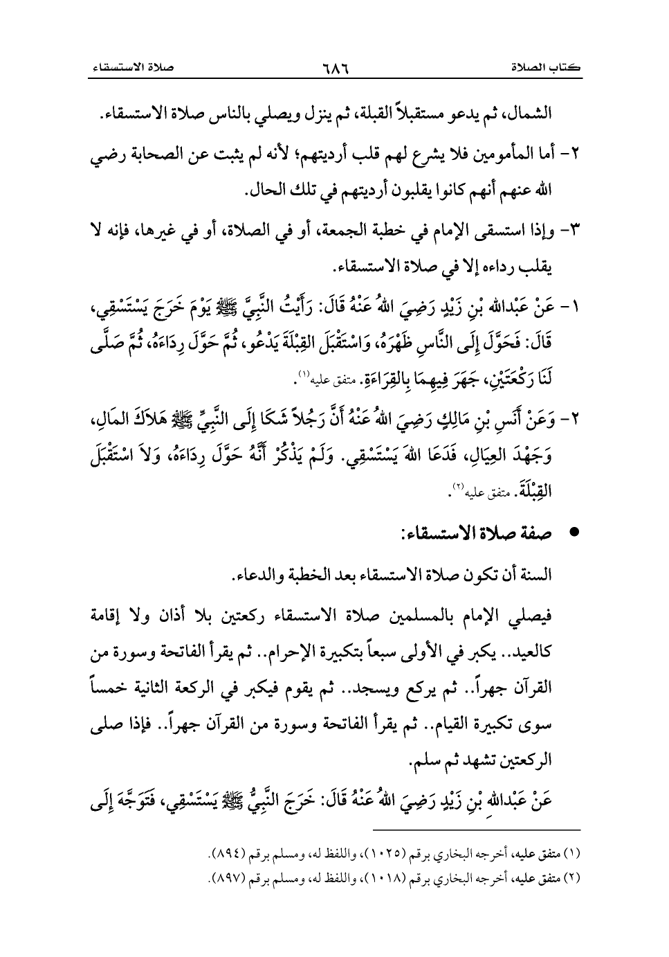 1 - عَنْ عَبْدالله بْنِ زَيْدٍ رَضِيَ اللهُ عَنْهُ قَالَ: رَأَيْتُ النَّبِيَّ - صلى الله عليه وسلم - يَوْمَ خَرَجَ يَسْتَسْقِي، قَالَ: فَحَوَّلَ إِلَى النَّاسِ ظَهْرَهُ، وَاسْتَقْبَلَ القِبْلَةَ يَدْعُو، ثُمَّ حَوَّلَ رِدَاءَهُ، ثُمَّ صَلَّى لَنَا رَكْعَتَيْنِ، جَهَرَ فِيهِمَا بِالقِرَاءَةِ. متفق عليه (¬1).