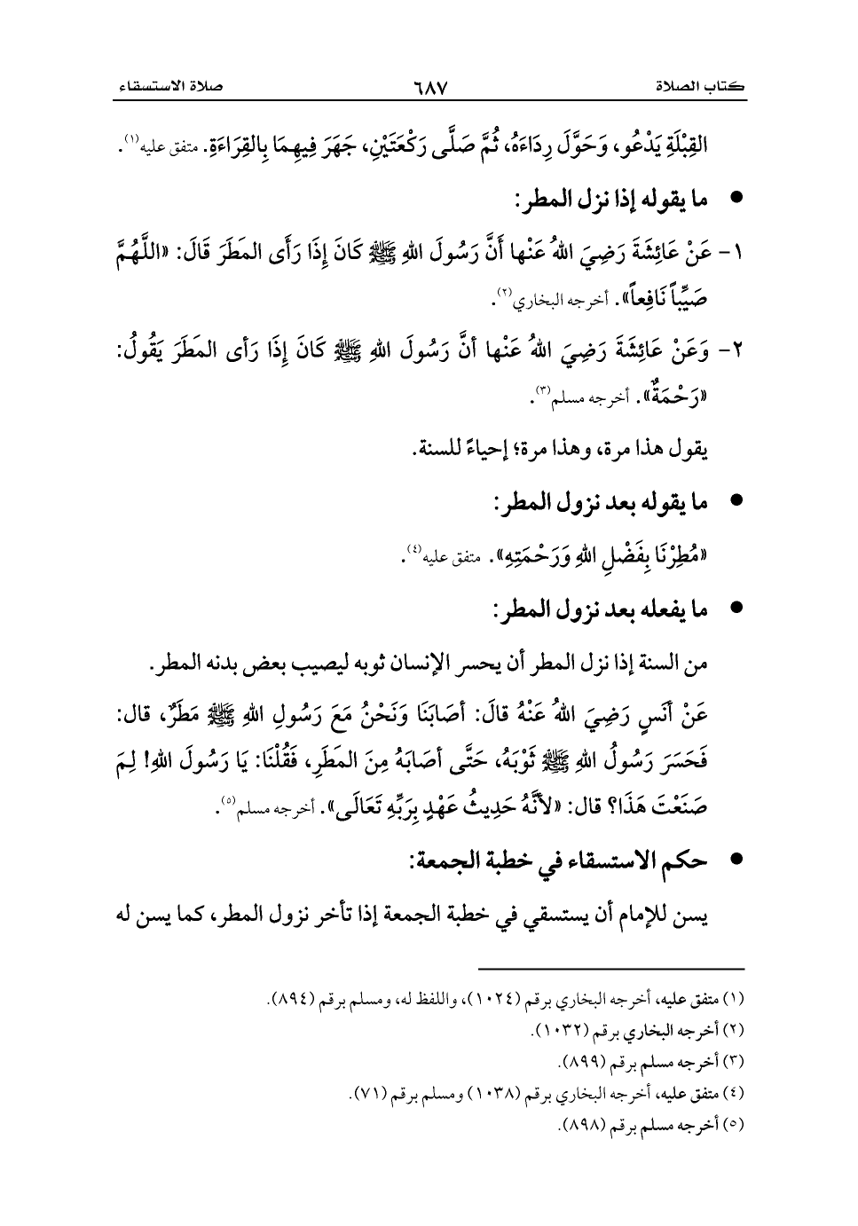 1 - عَنْ عَائِشَةَ رَضِيَ اللهُ عَنْها أَنَّ رَسُولَ اللهِ - صلى الله عليه وسلم - كَانَ إِذَا رَأَى المَطَرَ قَالَ: «اللَّهُمَّ صَيِّباً نَافِعاً». أخرجه البخاري (¬2).