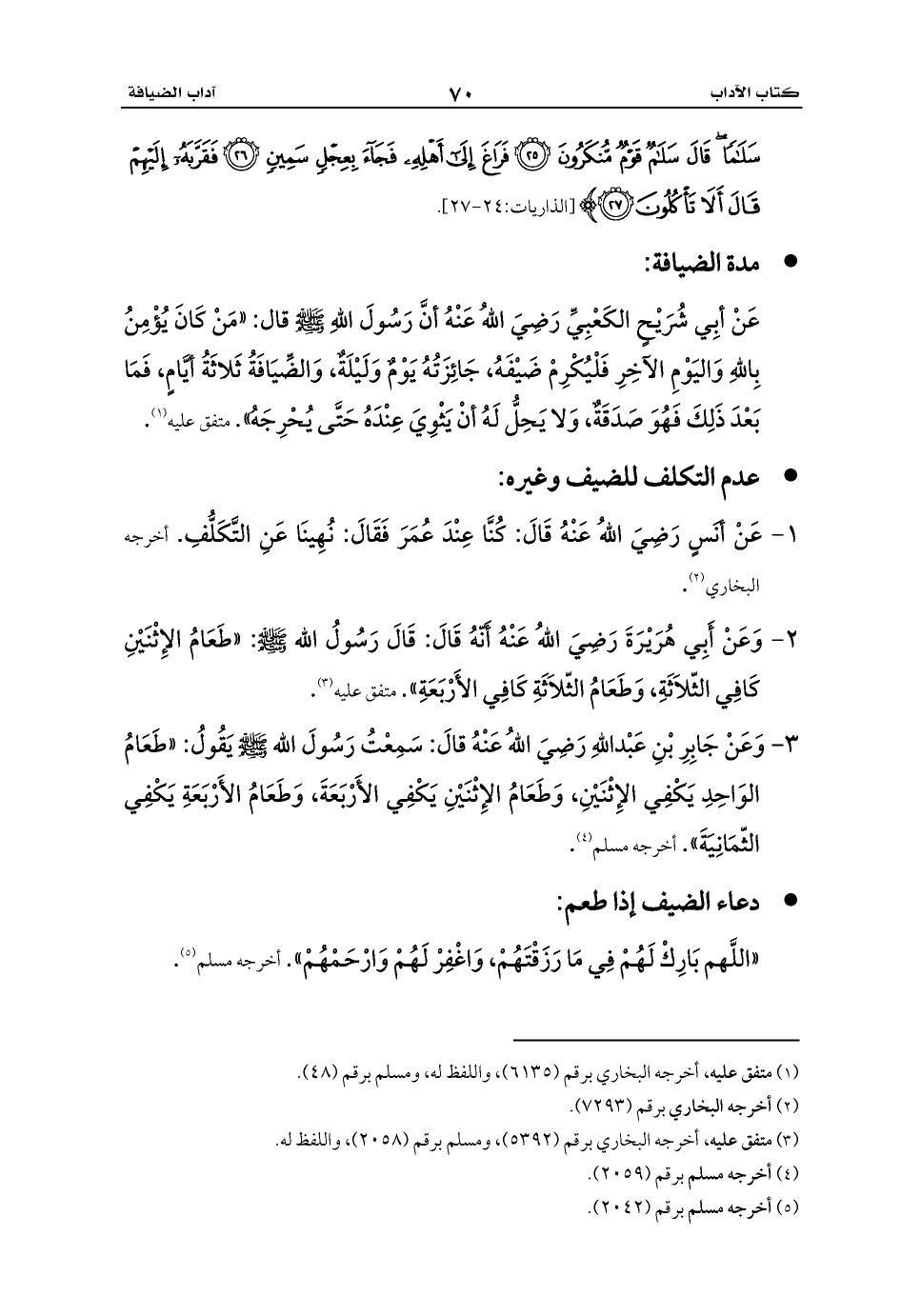 عَنْ أبِي شُرَيْحٍ الكَعْبِيِّ رَضِيَ اللهُ عَنْهُ أنَّ رَسُولَ اللهِ - صلى الله عليه وسلم - قال: «مَنْ كَانَ يُؤْمِنُ بِاللهِ وَاليَوْمِ الآخِرِ فَلْيُكْرِمْ ضَيْفَهُ، جَائِزَتُهُ يَوْمٌ وَلَيْلَةٌ، وَالضِّيَافَةُ ثَلاثَةُ أيَّامٍ، فَمَا بَعْدَ ذَلِكَ فَهُوَ صَدَقَةٌ، وَلا يَحِلُّ لَهُ أنْ يَثْوِيَ عِنْدَهُ حَتَّى يُحْرِجَهُ». متفق عليه (¬1).