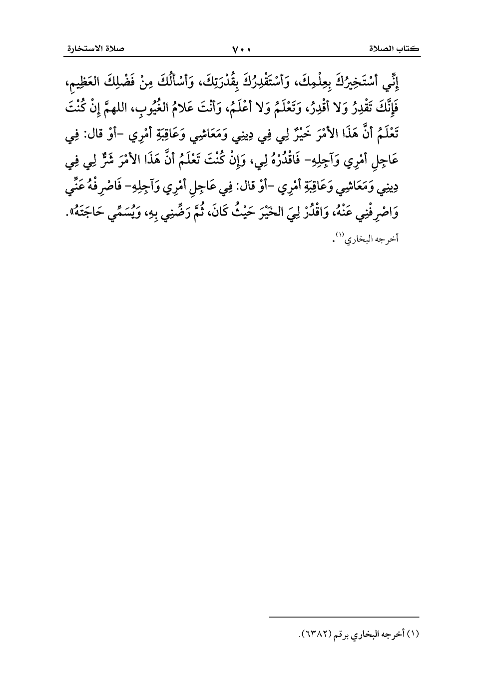 إِنِّي أسْتَخِيرُكَ بِعِلْمِكَ، وَأسْتَقْدِرُكَ بِقُدْرَتِكَ، وَأسْألُكَ مِنْ فَضْلِكَ العَظِيمِ، فَإِنَّكَ تَقْدِرُ وَلا أقْدِرُ، وَتَعْلَمُ وَلا أعْلَمُ، وَأنْتَ عَلامُ الغُيُوبِ، اللهمَّ إِنْ كُنْتَ تَعْلَمُ أنَّ هَذَا الأمْرَ خَيْرٌ لِي فِي دِينِي وَمَعَاشِي وَعَاقِبَةِ أمْرِي -أوْ قال: فِي عَاجِلِ أمْرِي وَآجِلِهِ- فَاقْدُرْهُ لِي، وَإِنْ كُنْتَ تَعْلَمُ أنَّ هَذَا الأمْرَ شَرٌّ لِي فِي دِينِي وَمَعَاشِي وَعَاقِبَةِ أمْرِي -أوْ قال: فِي عَاجِلِ أمْرِي وَآجِلِهِ- فَاصْرِفْهُ عَنِّي وَاصْرِفْنِي عَنْهُ، وَاقْدُرْ لِيَ الخَيْرَ حَيْثُ كَانَ، ثُمَّ رَضِّنِي بِهِ، وَيُسَمِّي حَاجَتَهُ». أخرجه البخاري (¬1).