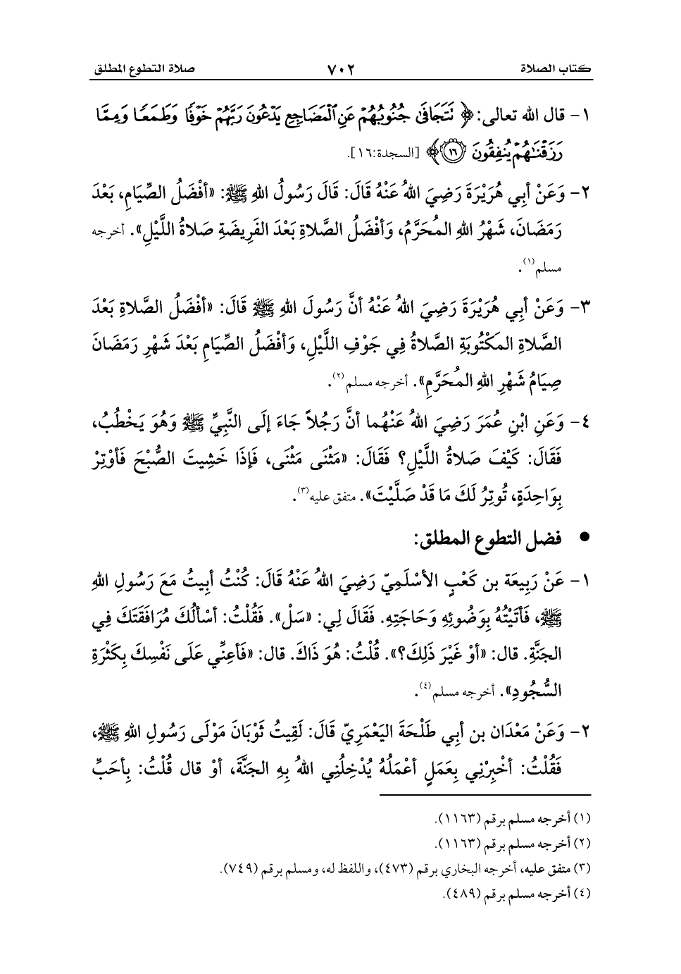 1 - عَنْ رَبِيعَة بن كَعْبٍ الأسْلَمِيّ رَضِيَ اللهُ عَنْهُ قَالَ: كُنْتُ أبِيتُ مَعَ رَسُولِ اللهِ - صلى الله عليه وسلم -، فَأتَيْتُهُ بِوَضُوئِهِ وَحَاجَتِهِ. فَقَالَ لِي: «سَلْ». فَقُلْتُ: أسْألُكَ مُرَافَقَتَكَ فِي الجَنَّةِ. قال: «أوْ غَيْرَ ذَلِكَ؟». قُلْتُ: هُوَ ذَاكَ. قال: «فَأعِنِّي عَلَى نَفْسِكَ بِكَثْرَةِ السُّجُودِ». أخرجه مسلم (¬4).
