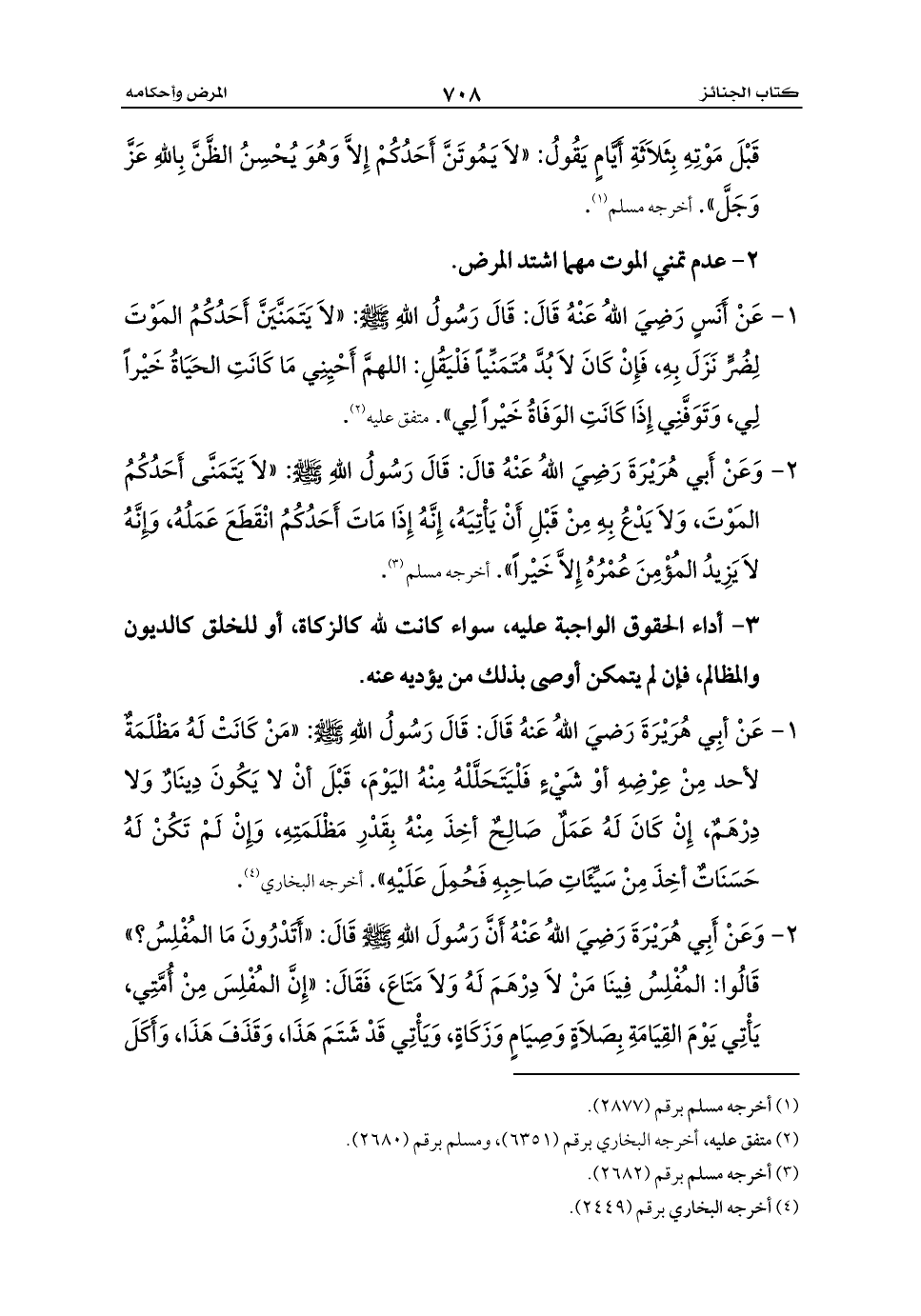 قَبْلَ مَوْتِهِ بِثَلاَثَةِ أَيَّامٍ يَقُولُ: «لاَ يَمُوتَنَّ أَحَدُكُمْ إِلاَّ وَهُوَ يُحْسِنُ الظَّنَّ بِاللهِ عَزَّ وَجَلَّ». أخرجه مسلم (¬1).