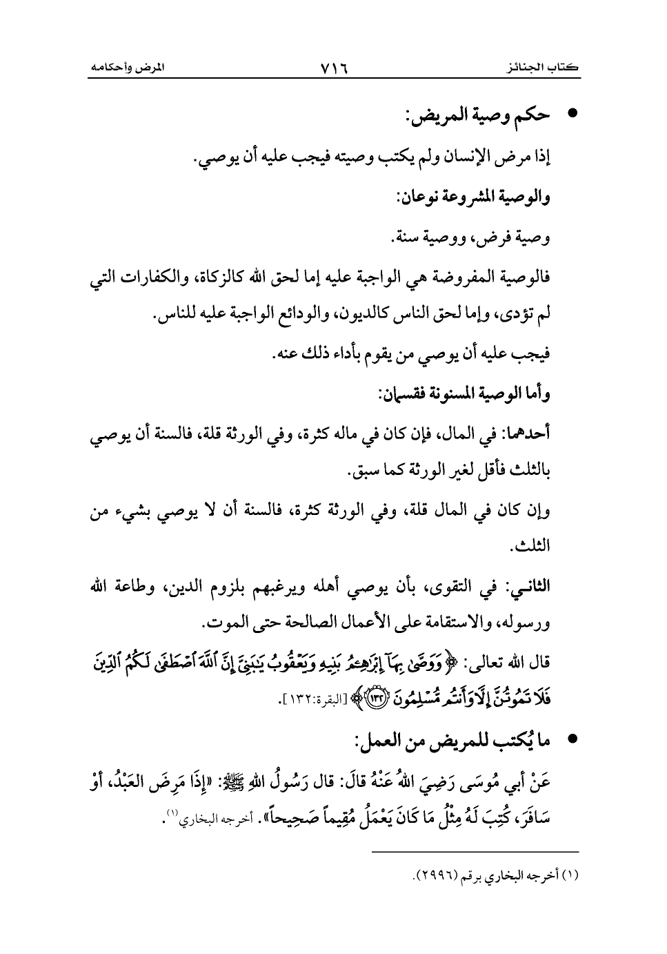 عَنْ أبي مُوسَى رَضِيَ اللهُ عَنْهُ قالَ: قال رَسُولُ اللهِ - صلى الله عليه وسلم -: «إِذَا مَرِضَ العَبْدُ، أوْ سَافَرَ، كُتِبَ لَهُ مِثْلُ مَا كَانَ يَعْمَلُ مُقِيماً صَحِيحاً». أخرجه البخاري (¬1).