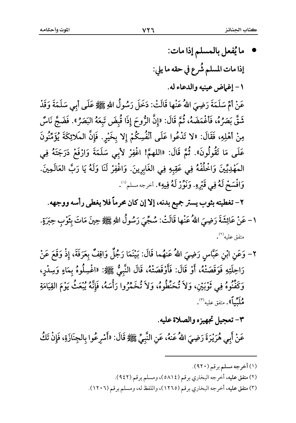 عَنْ أمِّ سَلَمَةَ رَضِيَ اللهُ عَنْها قَالَتْ: دَخَلَ رَسُولُ اللهِ - صلى الله عليه وسلم - عَلَى أبِي سَلَمَةَ وَقَدْ شَقَّ بَصَرُهُ، فَأغْمَضَهُ، ثُمَّ قَالَ: «إِنَّ الرُّوحَ إِذَا قُبِضَ تَبِعَهُ البَصَرُ». فَضَجَّ نَاسٌ مِنْ أهْلِهِ، فَقَالَ: «لا تَدْعُوا عَلَى أنْفُسِكُمْ إِلا بِخَيْرٍ. فَإِنَّ المَلائِكَةَ يُؤَمِّنُونَ عَلَى مَا تَقُولُونَ». ثُمَّ قَالَ: «اللهمَّ! اغْفِرْ لأبِي سَلَمَةَ وَارْفَعْ دَرَجَتَهُ فِي المَهْدِيِّينَ وَاخْلُفْهُ فِي عَقِبِهِ فِي الغَابِرِينَ. وَاغْفِرْ لَنَا وَلَهُ يَا رَبَّ العَالَمِينَ. وَافْسَحْ لَهُ فِي قَبْرِهِ. وَنَوِّرْ لَهُ فِيهِ». أخرجه مسلم (¬1).