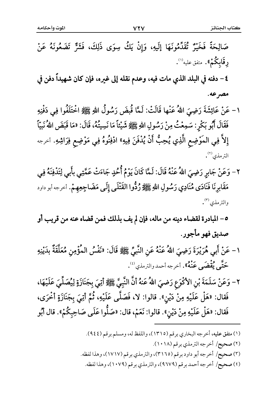 4 - دفنه في البلد الذي مات فيه، وعدم نقله إلى غيره، فإن كان شهيداً دفن في مصرعه.