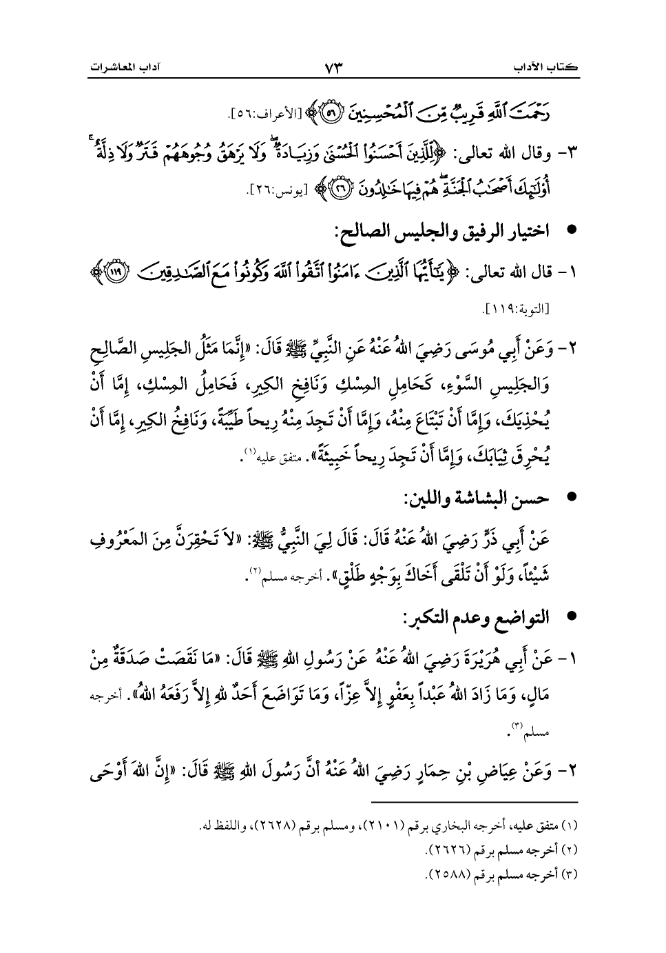 1 - عَنْ أَبِي هُرَيْرَةَ رَضِيَ اللهُ عَنْهُ عَنْ رَسُولِ اللهِ - صلى الله عليه وسلم - قَالَ: «مَا نَقَصَتْ صَدَقَةٌ مِنْ مَالٍ، وَمَا زَادَ اللهُ عَبْداً بِعَفْوٍ إِلاَّ عِزّاً، وَمَا تَوَاضَعَ أَحَدٌ للهِ إِلاَّ رَفَعَهُ اللهُ». أخرجه مسلم (¬3).