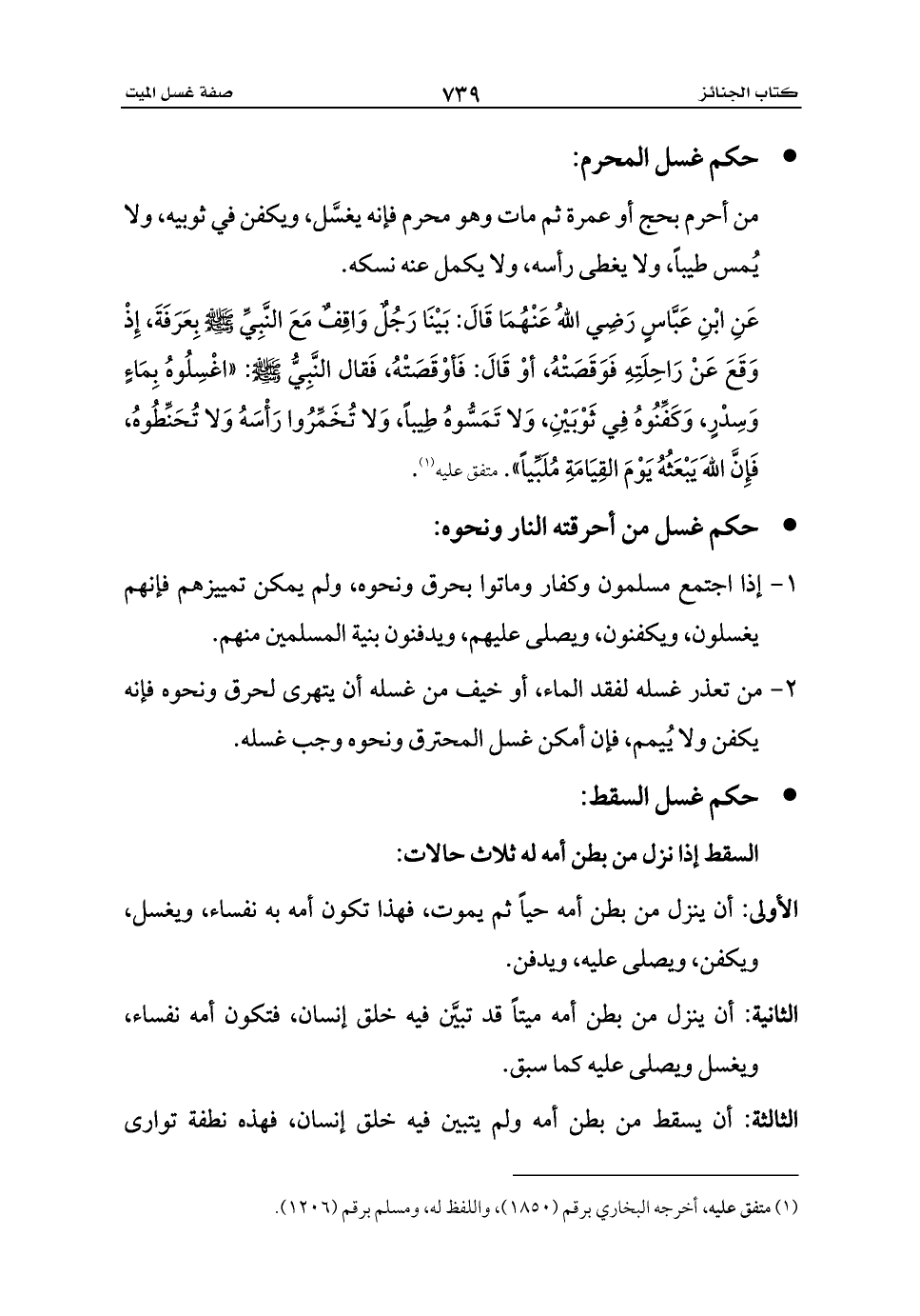 عَنِ ابْنِ عَبَّاسٍ رَضِي اللهُ عَنْهُمَا قَالَ: بَيْنَا رَجُلٌ وَاقِفٌ مَعَ النَّبِيِّ - صلى الله عليه وسلم - بِعَرَفَةَ، إِذْ وَقَعَ عَنْ رَاحِلَتِهِ فَوَقَصَتْهُ، أوْ قَالَ: فَأوْقَصَتْهُ، فَقال النَّبِيُّ - صلى الله عليه وسلم -: «اغْسِلُوهُ بِمَاءٍ وَسِدْرٍ، وَكَفِّنُوهُ فِي ثَوْبَيْنِ، وَلا تَمَسُّوهُ طِيباً، وَلا تُخَمِّرُوا رَأْسَهُ وَلا تُحَنِّطُوهُ، فَإِنَّ اللهَ يَبْعَثُهُ يَوْمَ القِيَامَةِ مُلَبِّياً». متفق عليه (¬1).