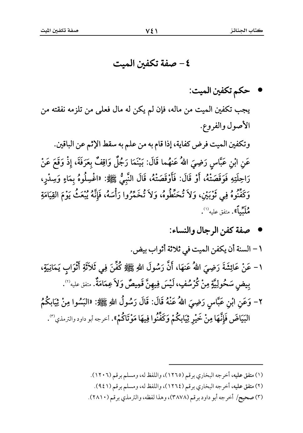 1 - عَنْ عَائِشَةَ رَضِيَ اللهُ عَنهَا، أَنَّ رَسُولَ اللهِ - صلى الله عليه وسلم - كُفِّنَ فِي ثَلاَثَةِ أَثْوَابٍ يَمَانِيَةٍ، بِيضٍ سَحُولِيَّةٍ مِنْ كُرْسُفٍ، لَيْسَ فِيهِنَّ قَمِيصٌ وَلاَ عِمَامَةٌ. متفق عليه (¬2).