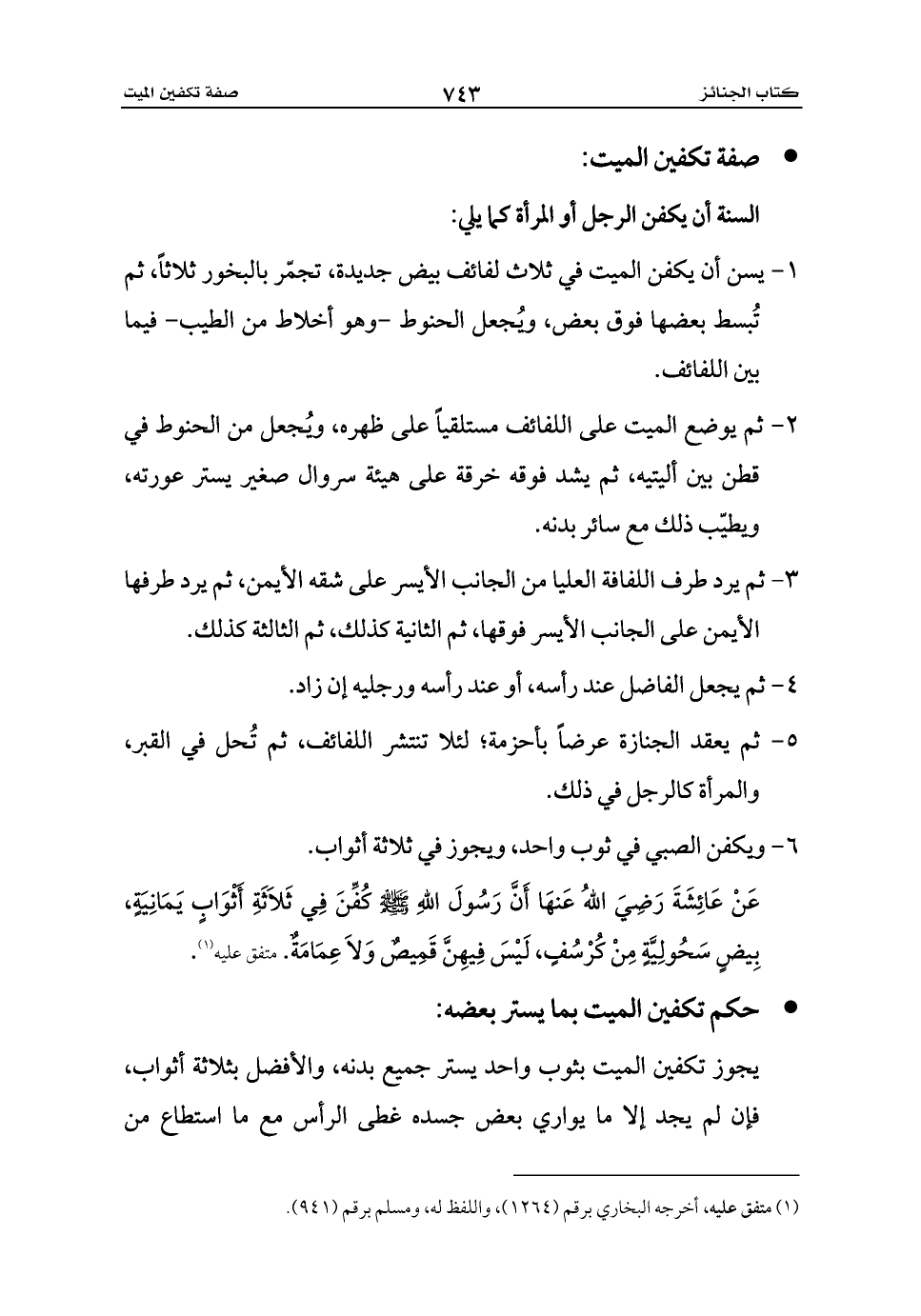 1 - يسن أن يكفن الميت في ثلاث لفائف بيض جديدة، تجمّر بالبخور ثلاثاً، ثم تُبسط بعضها فوق بعض، ويُجعل الحنوط -وهو أخلاط من الطيب- فيما بين اللفائف.