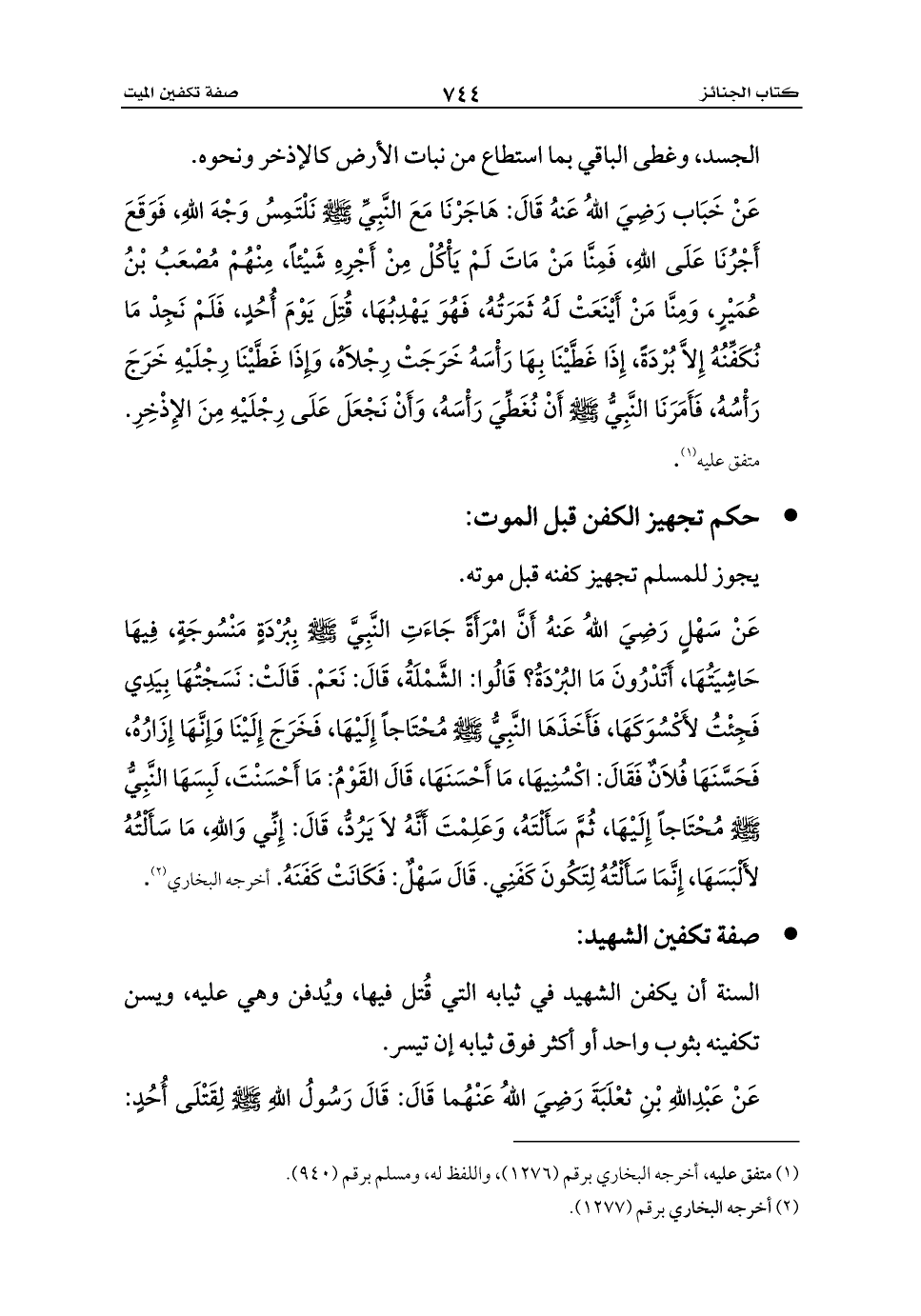 عَنْ خَبَاب رَضِيَ اللهُ عَنهُ قَالَ: هَاجَرْنَا مَعَ النَّبِيِّ - صلى الله عليه وسلم - نَلْتَمِسُ وَجْهَ اللهِ، فَوَقَعَ أَجْرُنَا عَلَى اللهِ، فَمِنَّا مَنْ مَاتَ لَمْ يَأْكُلْ مِنْ أَجْرِهِ شَيْئاً، مِنْهُمْ مُصْعَبُ بْنُ عُمَيْرٍ، وَمِنَّا مَنْ أَيْنَعَتْ لَهُ ثَمَرَتُهُ، فَهُوَ يَهْدِبُهَا، قُتِلَ يَوْمَ أُحُدٍ، فَلَمْ نَجِدْ مَا نُكَفِّنُهُ إِلاَّ بُرْدَةً، إِذَا غَطَّيْنَا بِهَا رَأْسَهُ خَرَجَتْ رِجْلاَهُ، وَإِذَا غَطَّيْنَا رِجْلَيْهِ خَرَجَ رَأْسُهُ، فَأَمَرَنَا النَّبِيُّ - صلى الله عليه وسلم - أَنْ نُغَطِّيَ رَأْسَهُ، وَأَنْ نَجْعَلَ عَلَى رِجْلَيْهِ مِنَ الإِذْخِرِ. متفق عليه (¬1).