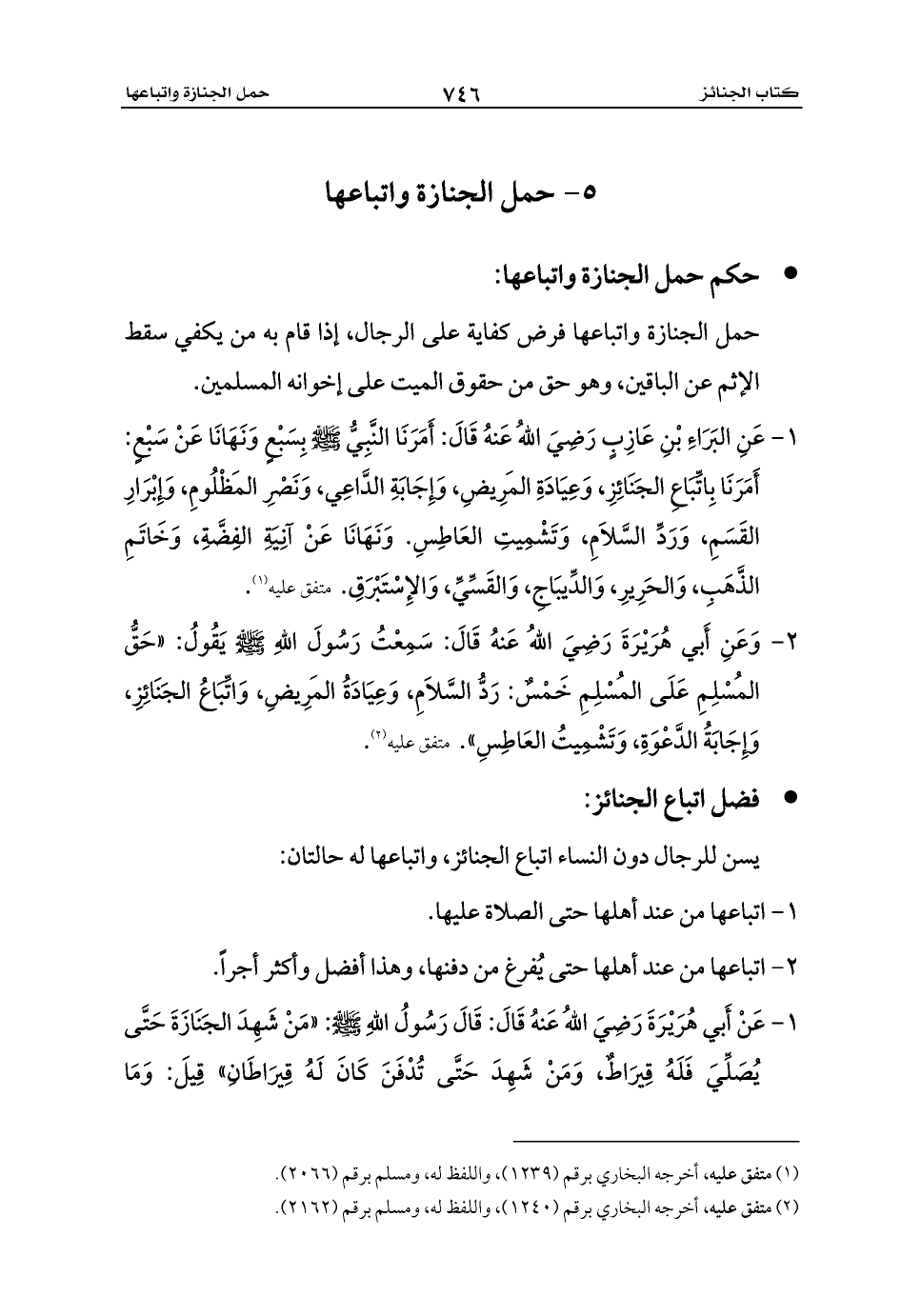 2 - وَعَنِ أَبي هُرَيْرَةَ رَضِيَ اللهُ عَنهُ قَالَ: سَمِعْتُ رَسُولَ اللهِ - صلى الله عليه وسلم - يَقُولُ: «حَقُّ المُسْلِمِ عَلَى المُسْلِمِ خَمْسٌ: رَدُّ السَّلاَمِ، وَعِيَادَةُ المَرِيضِ، وَاتِّبَاعُ الجَنَائِزِ، وَإِجَابَةُ الدَّعْوَةِ، وَتَشْمِيتُ العَاطِسِ». متفق عليه (¬2).