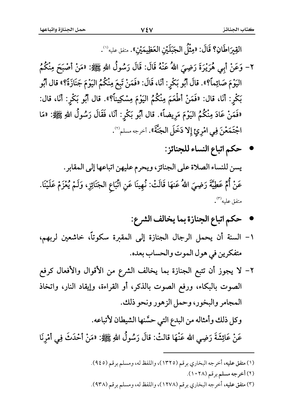 عَنْ أُمِّ عَطِيَّةَ رَضِيَ اللهُ عَنهَا قَالَتْ: نُهِينَا عَنِ اتِّبَاعِ الجَنَائِزِ، وَلَمْ يُعْزَمْ عَلَيْنَا. متفق عليه (¬3).