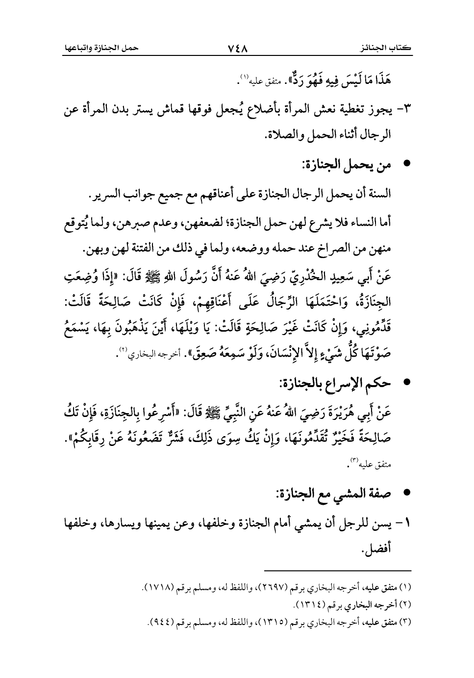 عَنْ أَبِي هُرَيْرَةَ رَضِيَ اللهُ عَنهُ عَنِ النَّبِيِّ - صلى الله عليه وسلم - قَالَ: «أَسْرِعُوا بِالجِنَازَةِ، فَإِنْ تَكُ صَالِحَةً فَخَيْرٌ تُقَدِّمُونَهَا، وَإِنْ يَكُ سِوَى ذَلِكَ، فَشَرٌّ تَضَعُونَهُ عَنْ رِقَابِكُمْ». متفق عليه (¬3).
