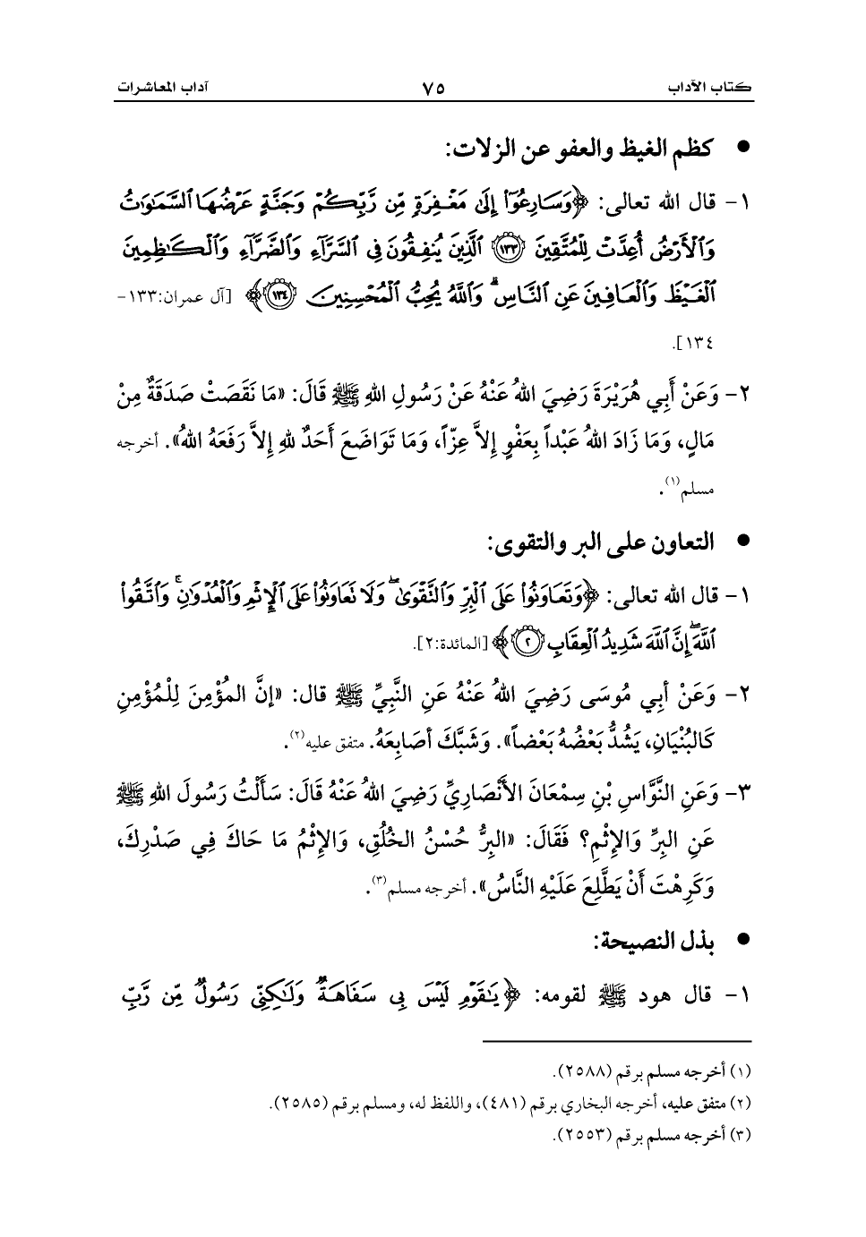 1 - قال الله تعالى: {وَسَارِعُوا إِلَى مَغْفِرَةٍ مِنْ رَبِّكُمْ وَجَنَّةٍ عَرْضُهَا السَّمَاوَاتُ وَالْأَرْضُ أُعِدَّتْ لِلْمُتَّقِينَ (133) الَّذِينَ يُنْفِقُونَ فِي السَّرَّاءِ وَالضَّرَّاءِ وَالْكَاظِمِينَ الْغَيْظَ وَالْعَافِينَ عَنِ النَّاسِ وَاللَّهُ يُحِبُّ الْمُحْسِنِينَ (134)} [آل عمران:133 - 134].
