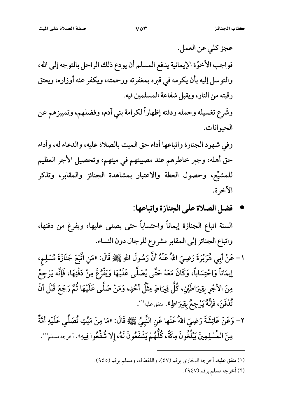 1 - عَنْ أبِي هُرَيْرَةَ رَضِيَ اللهُ عَنْهُ أنَّ رَسُولَ اللهِ - صلى الله عليه وسلم - قَالَ: «مَنِ اتَّبَعَ جَنَازَةَ مُسْلِمٍ، إيمَاناً وَاحْتِسَاباً، وَكَانَ مَعَهُ حَتَّى يُصَلَّى عَلَيْهَا وَيَفْرُغَ مِنْ دَفْنِهَا، فَإنَّه يَرْجِعُ مِنَ الأجْرِ بِقِيرَاطَيْنِ، كُلُّ قِيرَاطٍ مِثْلُ أحُدٍ، وَمَنْ صَلَّى عَلَيْهَا ثُمَّ رَجَعَ قَبْلَ أنْ تُدْفَنَ، فَإنَّهُ يَرْجِعُ بِقِيرَاطٍ». متفق عليه (¬1).