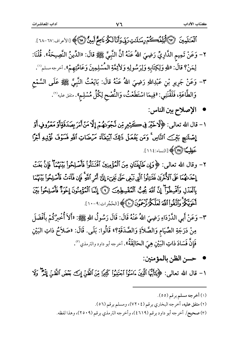 1 - قال الله تعالى: {لَا خَيْرَ فِي كَثِيرٍ مِنْ نَجْوَاهُمْ إِلَّا مَنْ أَمَرَ بِصَدَقَةٍ أَوْ مَعْرُوفٍ أَوْ إِصْلَاحٍ بَيْنَ النَّاسِ وَمَنْ يَفْعَلْ ذَلِكَ ابْتِغَاءَ مَرْضَاتِ اللَّهِ فَسَوْفَ نُؤْتِيهِ أَجْرًا عَظِيمًا (114)} [النساء:114].