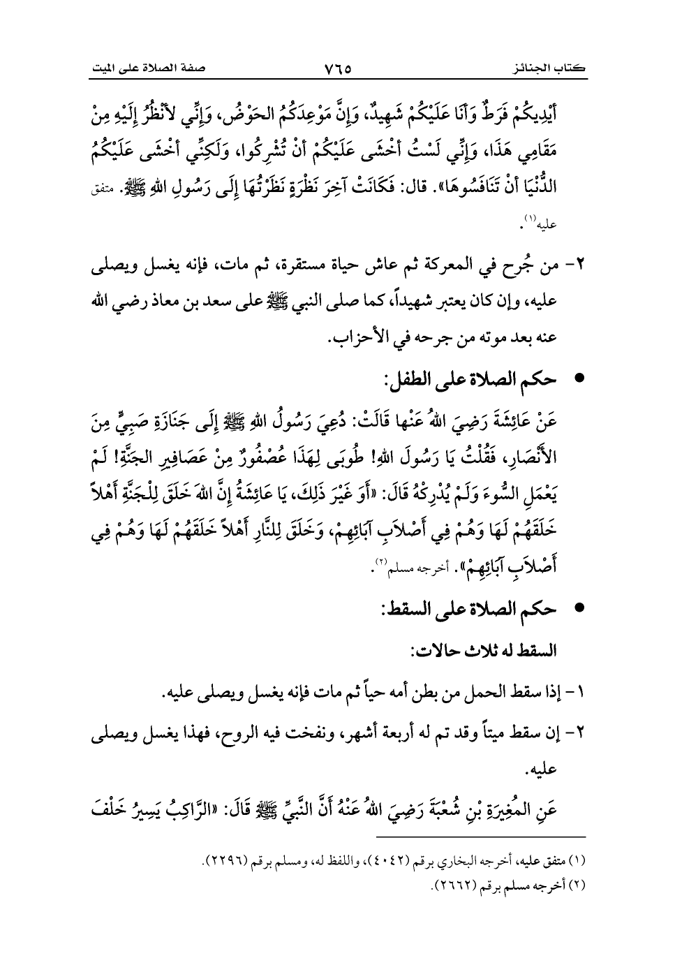2 - من جُرح في المعركة ثم عاش حياة مستقرة، ثم مات، فإنه يغسل ويصلى عليه، وإن كان يعتبر شهيداً، كما صلى النبي - صلى الله عليه وسلم - على سعد بن معاذ رضي الله عنه بعد موته من جرحه في الأحزاب.
