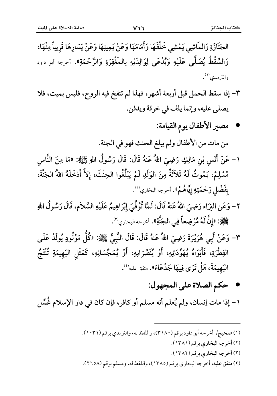 الجَنَازَةِ وَالمَاشِي يَمْشِي خَلْفَهَا وَأَمَامَهَا وَعَنْ يَمِينِهَا وَعَنْ يَسَارِهَا قَرِيباً مِنْهَا، وَالسِّقْطُ يُصَلَّى عَلَيْهِ وَيُدْعَى لِوَالِدَيْهِ بالمَغْفِرَةِ وَالرَّحْمَةِ». أخرجه أبو داود والترمذي (¬1).