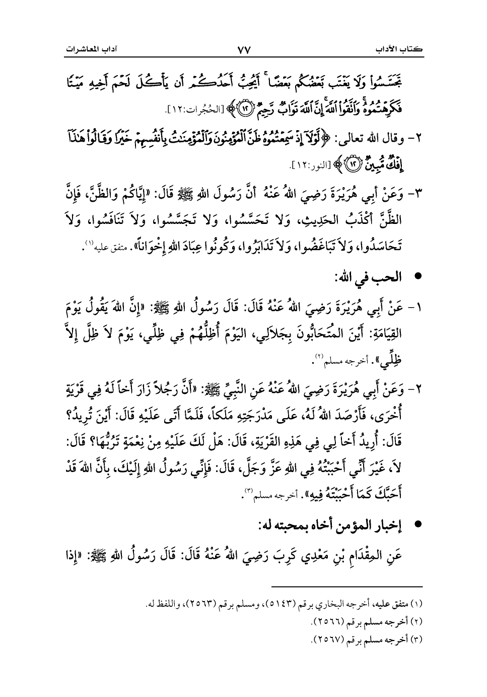 2 - وَعَنْ أَبِي هُرَيْرَةَ رَضِيَ اللهُ عَنْهُ عَنِ النَّبِيِّ - صلى الله عليه وسلم -: «أَنَّ رَجُلاً زَارَ أَخاً لَهُ فِي قَرْيَةٍ أُخْرَى، فَأَرْصَدَ اللهُ لَهُ، عَلَى مَدْرَجَتِهِ مَلَكاً، فَلَمَّا أَتَى عَلَيْهِ قَالَ: أَيْنَ تُرِيدُ؟ قَالَ: أُرِيدُ أَخاً لِي فِي هَذِهِ القَرْيَةِ، قَالَ: هَلْ لَكَ عَلَيْهِ مِنْ نِعْمَةٍ تَرُبُّهَا؟ قَالَ: لاَ، غَيْرَ أَنِّي أَحْبَبْتُهُ فِي اللهِ عَزَّ وَجَلَّ، قَالَ: فَإِنِّي رَسُولُ اللهِ إِلَيْكَ، بِأَنَّ اللهَ قَدْ أَحَبَّكَ كَمَا أَحْبَبْتَهُ فِيهِ». أخرجه مسلم (¬3).