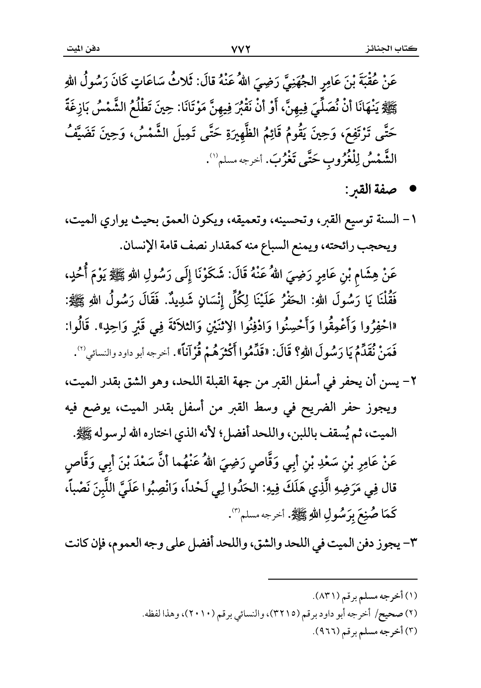 عَنْ عُقْبَةَ بْنَ عَامِرٍ الجُهَنِيَّ رَضِيَ اللهُ عَنْهُ قالَ: ثَلاثُ سَاعَاتٍ كَانَ رَسُولُ اللهِ - صلى الله عليه وسلم - يَنْهَانَا أنْ نُصَلِّيَ فِيهِنَّ، أَوْ أنْ نَقْبُرَ فِيهِنَّ مَوْتَانَا: حِينَ تَطْلُعُ الشَّمْسُ بَازِغَةً حَتَّى تَرْتَفِعَ، وَحِينَ يَقُومُ قَائِمُ الظَّهِيرَةِ حَتَّى تَمِيلَ الشَّمْسُ، وَحِينَ تَضَيَّفُ الشَّمْسُ لِلْغُرُوبِ حَتَّى تَغْرُبَ. أخرجه مسلم (¬1).