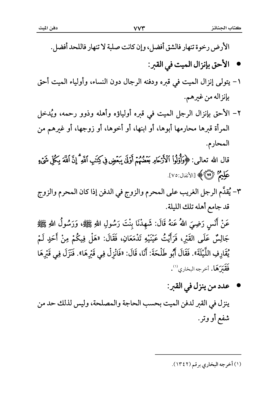 2 - الأحق بإنزال الرجل الميت في قبره أولياؤه وأهله وذوو رحمه، ويُدخل المرأة قبرها محارمها أبوها، أو ابنها، أو أخوها، أو زوجها، أو غيرهم من المحارم.