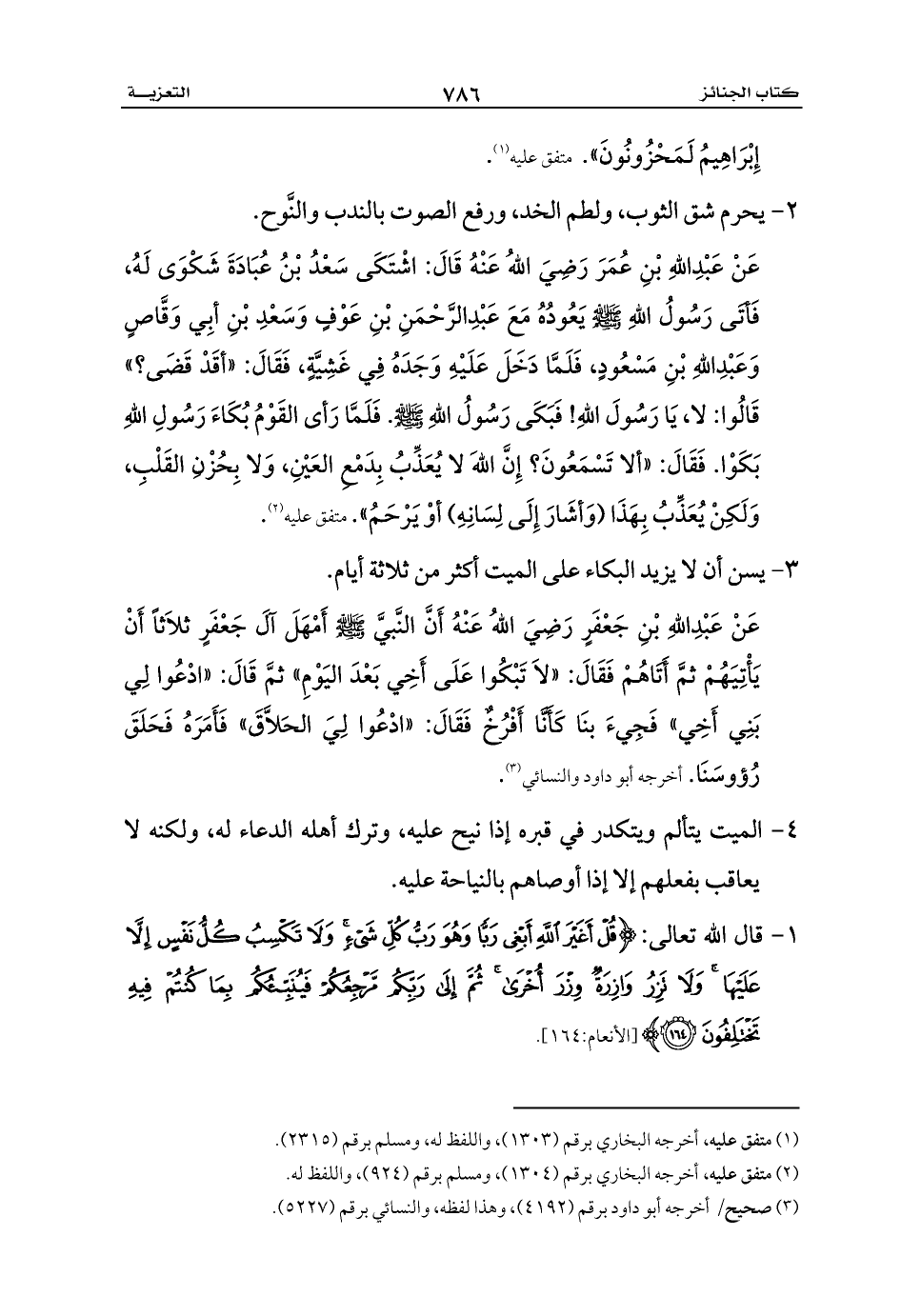 2 - يحرم شق الثوب، ولطم الخد، ورفع الصوت بالندب والنَّوح.