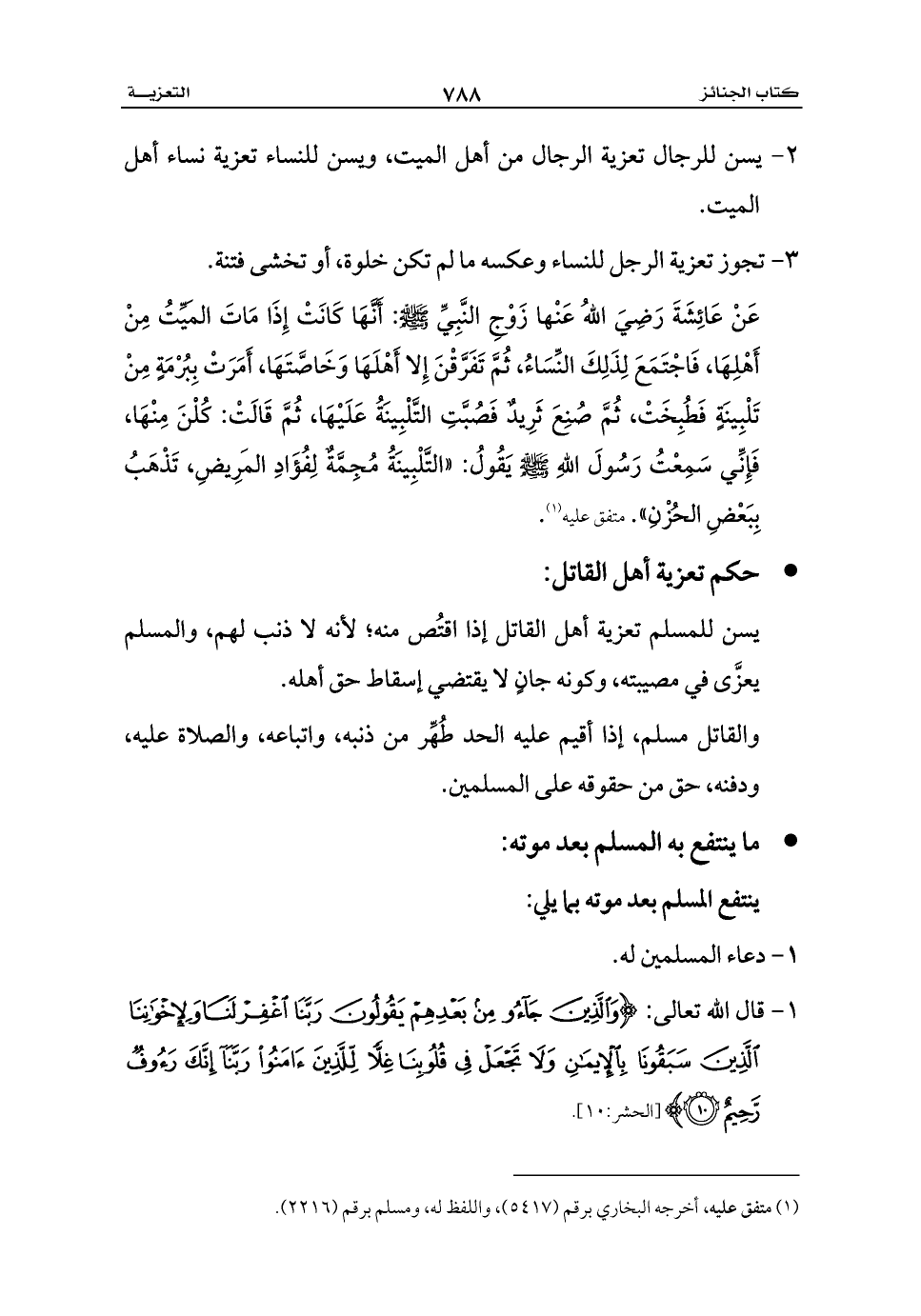3 - تجوز تعزية الرجل للنساء وعكسه ما لم تكن خلوة، أو تخشى فتنة.