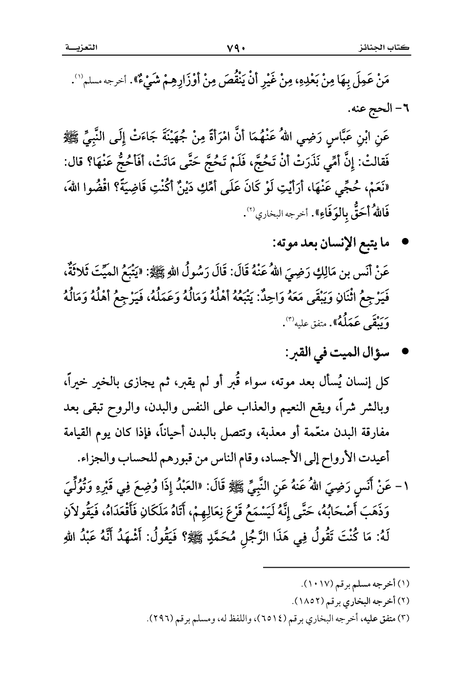 عَنْ أنَس بن مَالِكٍ رَضِيَ اللهُ عَنْهُ قَالَ: قَالَ رَسُولُ اللهِ - صلى الله عليه وسلم -: «يَتْبَعُ المَيِّتَ ثَلاثَةٌ، فَيَرْجِعُ اثْنَانِ وَيَبْقَى مَعَهُ وَاحِدٌ: يَتْبَعُهُ أهْلُهُ وَمَالُهُ وَعَمَلُهُ، فَيَرْجِعُ أهْلُهُ وَمَالُهُ وَيَبْقَى عَمَلُهُ». متفق عليه (¬3).