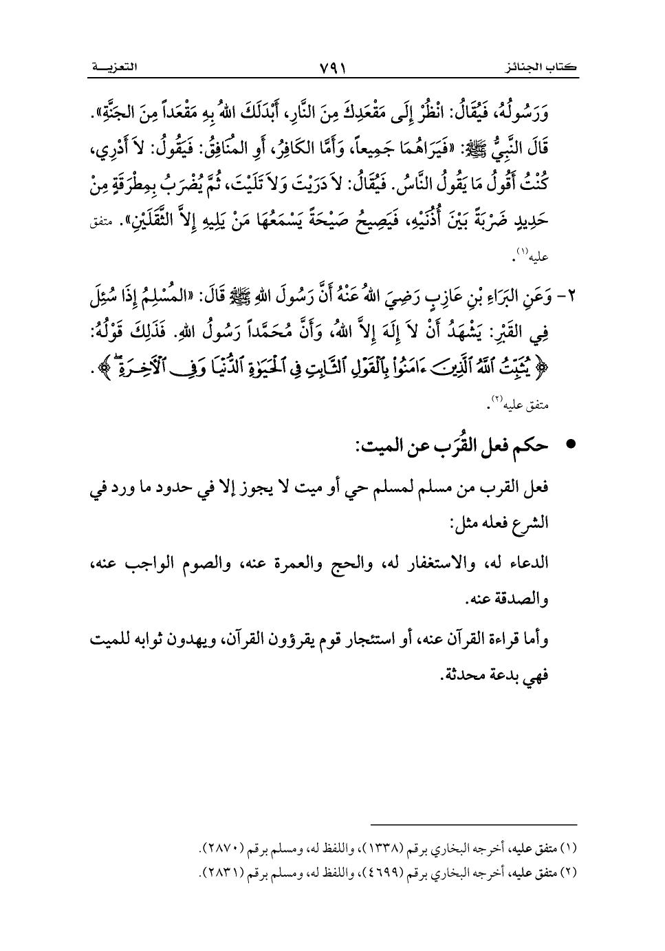2 - وَعَنِ البَرَاءِ بْنِ عَازِبٍ رَضِيَ اللهُ عَنْهُ أَنَّ رَسُولَ اللهِ - صلى الله عليه وسلم - قَالَ: «المُسْلِمُ إِذَا سُئِلَ فِي القَبْرِ: يَشْهَدُ أَنْ لاَ إِلَهَ إِلاَّ اللهُ، وَأَنَّ مُحَمَّداً رَسُولُ اللهِ. فَذَلِكَ قَوْلُهُ: {يُثَبِّتُ اللَّهُ الَّذِينَ آمَنُوا بِالْقَوْلِ الثَّابِتِ فِي الْحَيَاةِ الدُّنْيَا وَفِي الْآخِرَةِ}. متفق عليه (¬2).