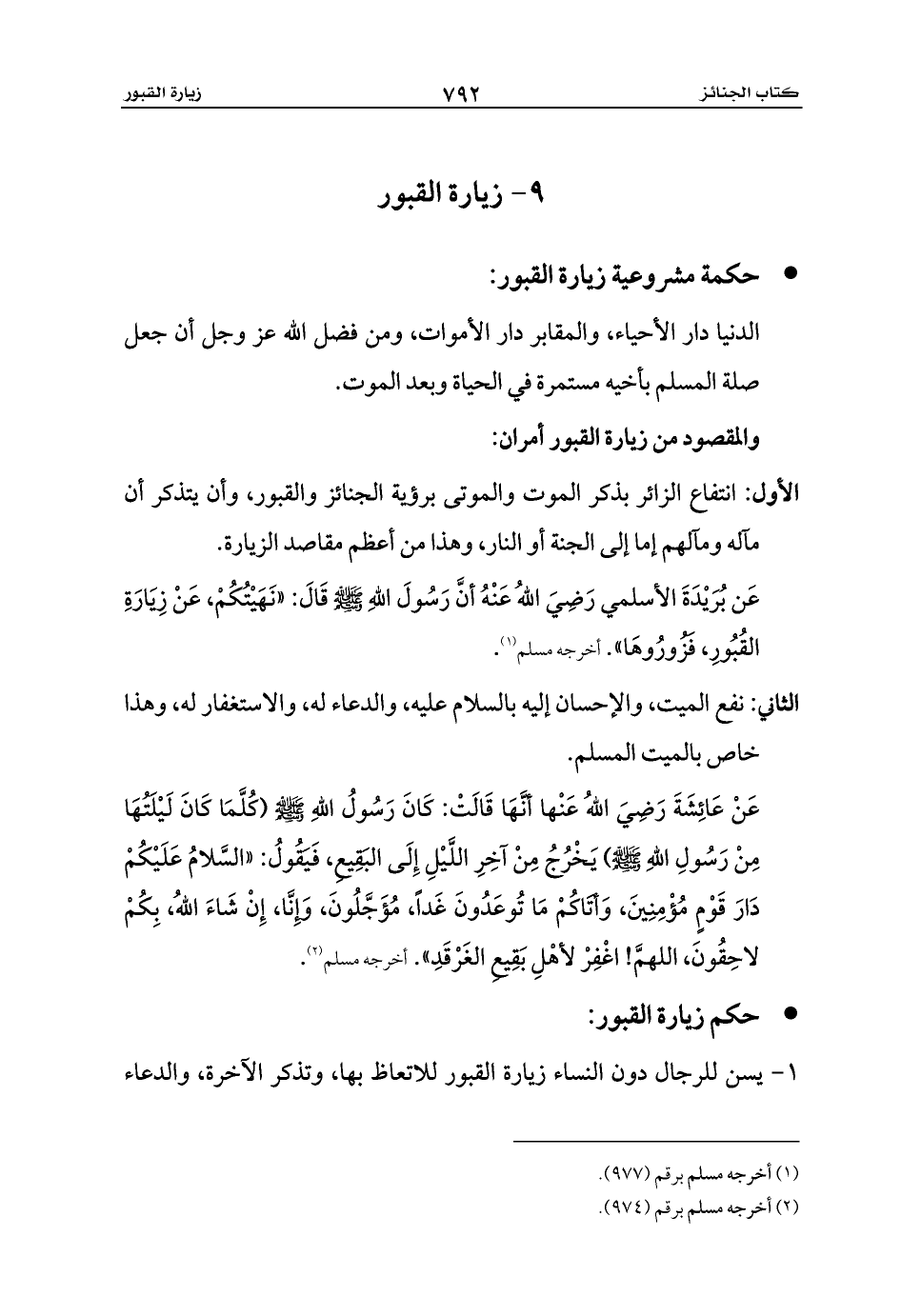 1 - يسن للرجال دون النساء زيارة القبور للاتعاظ بها، وتذكر الآخرة، والدعاء