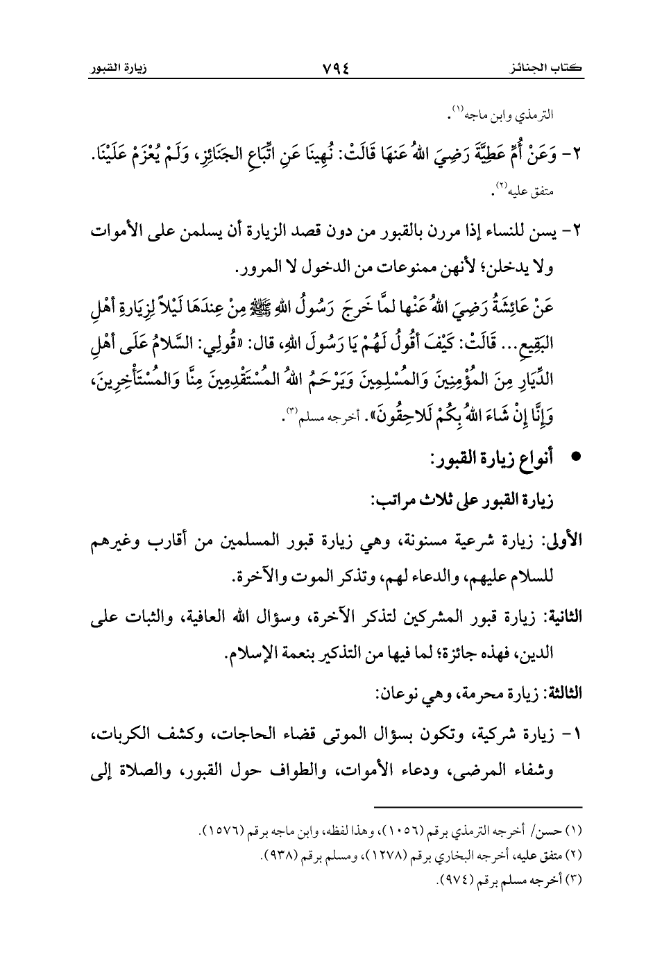 2 - يسن للنساء إذا مررن بالقبور من دون قصد الزيارة أن يسلمن على الأموات ولا يدخلن؛ لأنهن ممنوعات من الدخول لا المرور.