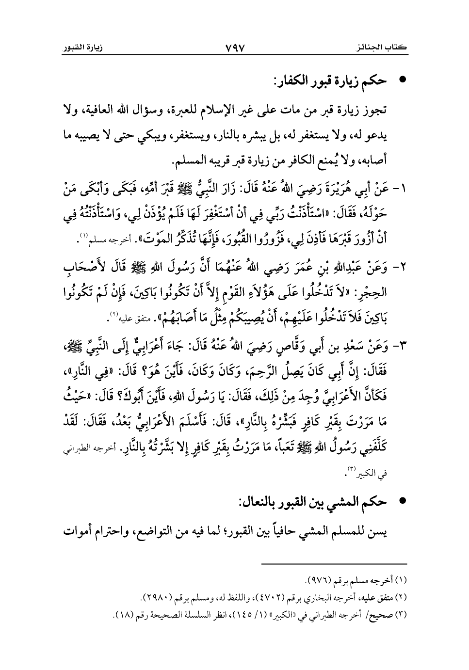 1 - عَنْ أبِي هُرَيْرَةَ رَضِيَ اللهُ عَنْهُ قَالَ: زَارَ النَّبِيُّ - صلى الله عليه وسلم - قَبْرَ أمِّهِ، فَبَكَى وَأبْكَى مَنْ حَوْلَهُ، فَقَالَ: «اسْتَأْذَنْتُ رَبِّي فِي أنْ أسْتَغْفِرَ لَهَا فَلَمْ يُؤْذَنْ لِي، وَاسْتَأْذَنْتُهُ فِي أنْ أزُورَ قَبْرَهَا فَأذِنَ لِي، فَزُورُوا القُبُورَ، فَإِنَّهَا تُذَكِّرُ المَوْتَ». أخرجه مسلم (¬1).
