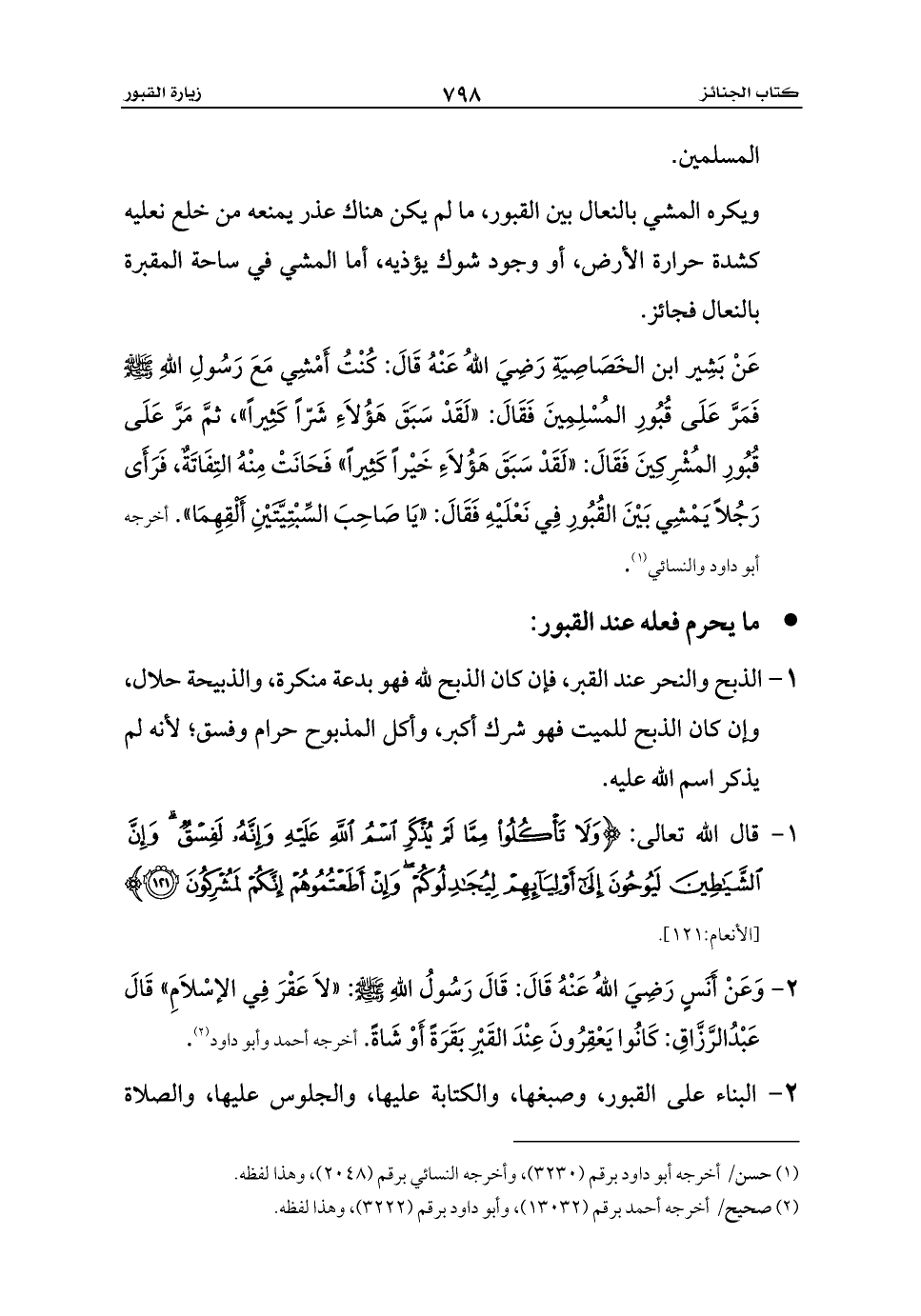عَنْ بَشِير ابن الخَصَاصِيَةِ رَضِيَ اللهُ عَنْهُ قَالَ: كُنْتُ أَمْشِي مَعَ رَسُولِ اللهِ - صلى الله عليه وسلم - فَمَرَّ عَلَى قُبُورِ المُسْلِمِينَ فَقَالَ: «لَقَدْ سَبَقَ هَؤُلاَءِ شَرّاً كَثِيراً»، ثمَّ مَرَّ عَلَى قُبُورِ المُشْرِكِينَ فَقَالَ: «لَقَدْ سَبَقَ هَؤُلاَءِ خَيْراً كَثِيراً» فَحَانَتْ مِنْهُ التِفَاتَةٌ، فَرَأَى رَجُلاً يَمْشِي بَيْنَ القُبُورِ فِي نَعْلَيْهِ فَقَالَ: «يَا صَاحِبَ السِّبْتِيَّتَيْنِ أَلْقِهِمَا». أخرجه أبو داود والنسائي (¬1).