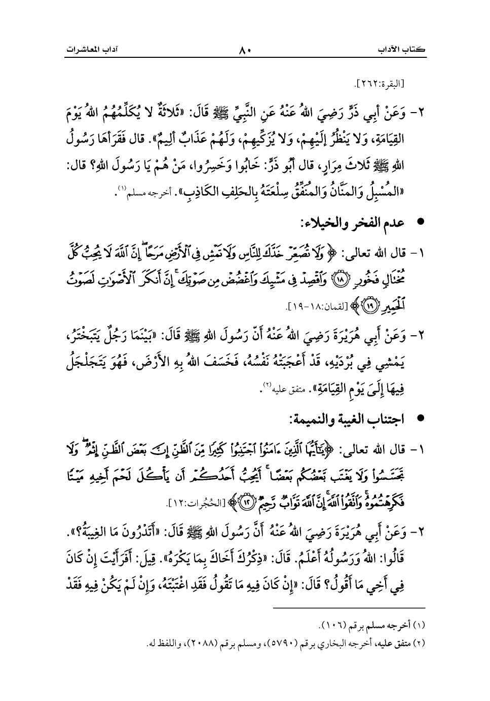 1 - قال الله تعالى: {وَلَا تُصَعِّرْ خَدَّكَ لِلنَّاسِ وَلَا تَمْشِ فِي الْأَرْضِ مَرَحًا إِنَّ اللَّهَ لَا يُحِبُّ كُلَّ مُخْتَالٍ فَخُورٍ (18) وَاقْصِدْ فِي مَشْيِكَ وَاغْضُضْ مِنْ صَوْتِكَ إِنَّ أَنْكَرَ الْأَصْوَاتِ لَصَوْتُ الْحَمِيرِ (19)} [لقمان:18 - 19].