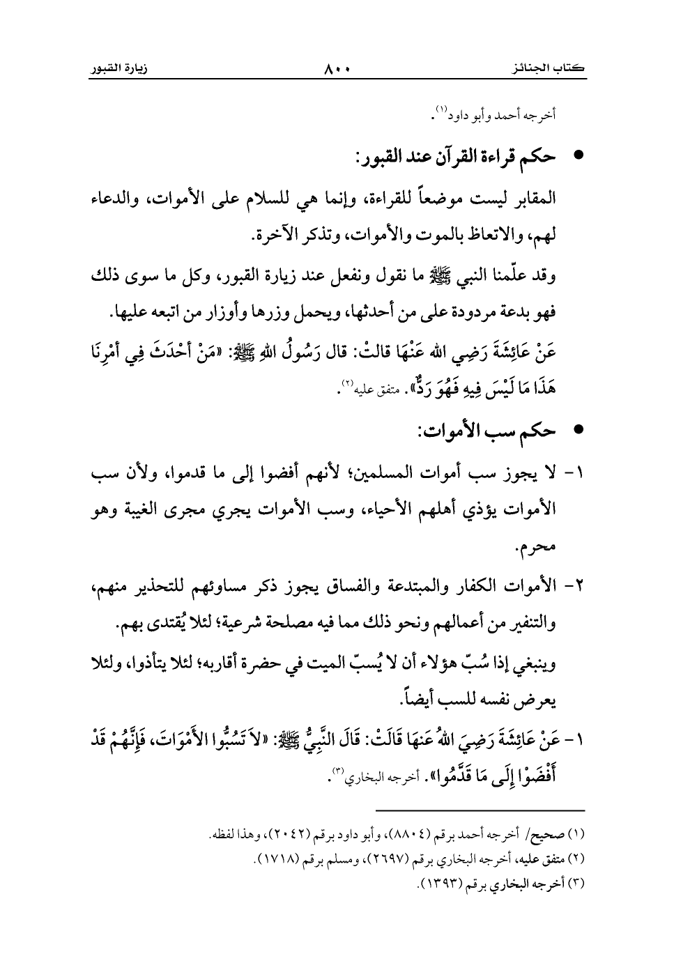 1 - عَنْ عَائِشَةَ رَضِيَ اللهُ عَنهَا قَالَتْ: قَالَ النَّبِيُّ - صلى الله عليه وسلم -: «لاَ تَسُبُّوا الأَمْوَاتَ، فَإِنَّهُمْ قَدْ أَفْضَوْا إِلَى مَا قَدَّمُوا». أخرجه البخاري (¬3).
