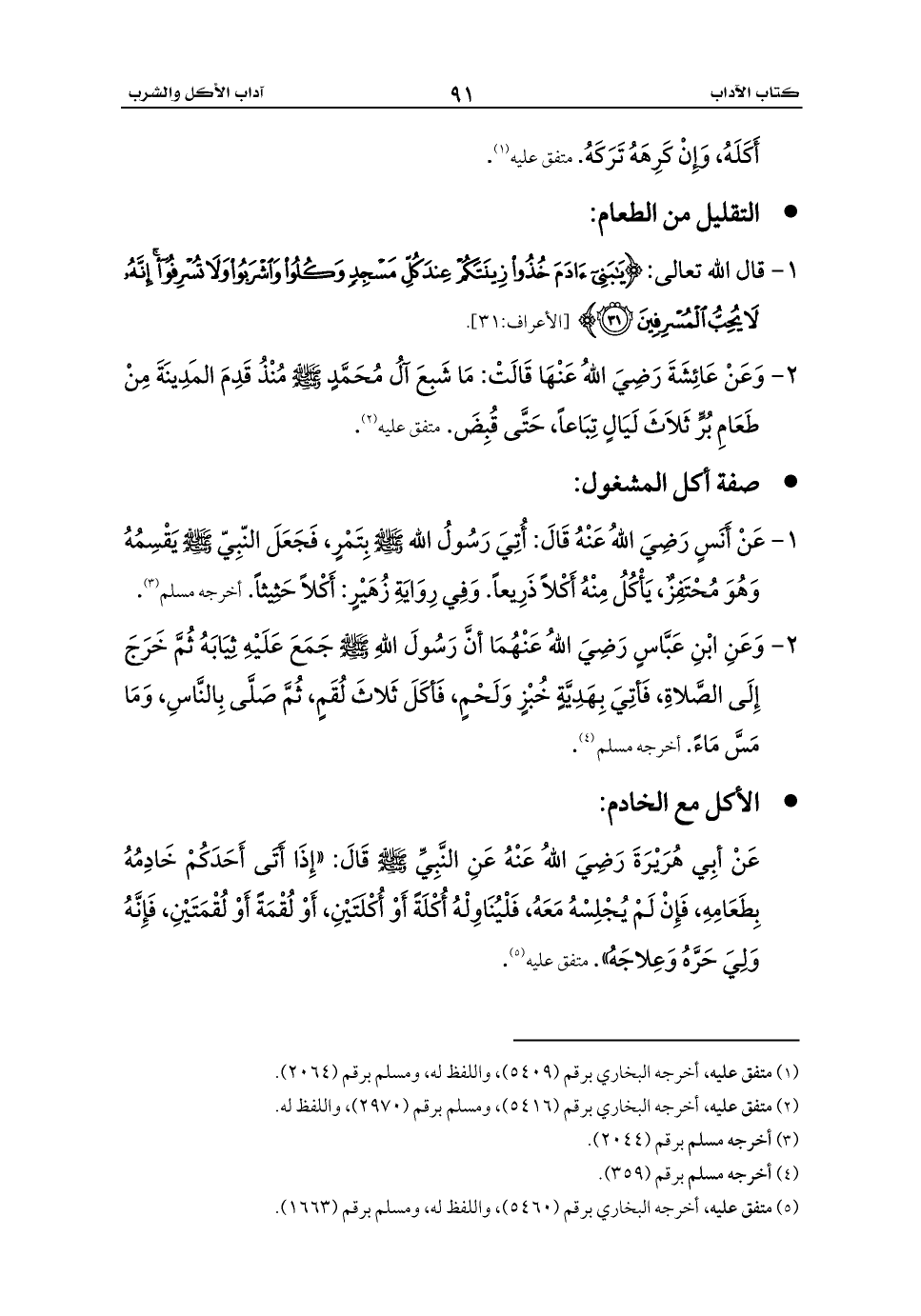 عَنْ أبِي هُرَيْرَةَ رَضِيَ اللهُ عَنْهُ عَنِ النَّبِيِّ - صلى الله عليه وسلم - قَالَ: «إِذَا أَتَى أَحَدَكُمْ خَادِمُهُ بِطَعَامِهِ، فَإِنْ لَمْ يُجْلِسْهُ مَعَهُ، فَلْيُنَاوِلْهُ أُكْلَةً أَوْ أُكْلَتَيْنِ، أَوْ لُقْمَةً أَوْ لُقْمَتَيْنِ، فَإِنَّهُ وَلِيَ حَرَّهُ وَعِلاجَهُ». متفق عليه (¬5).