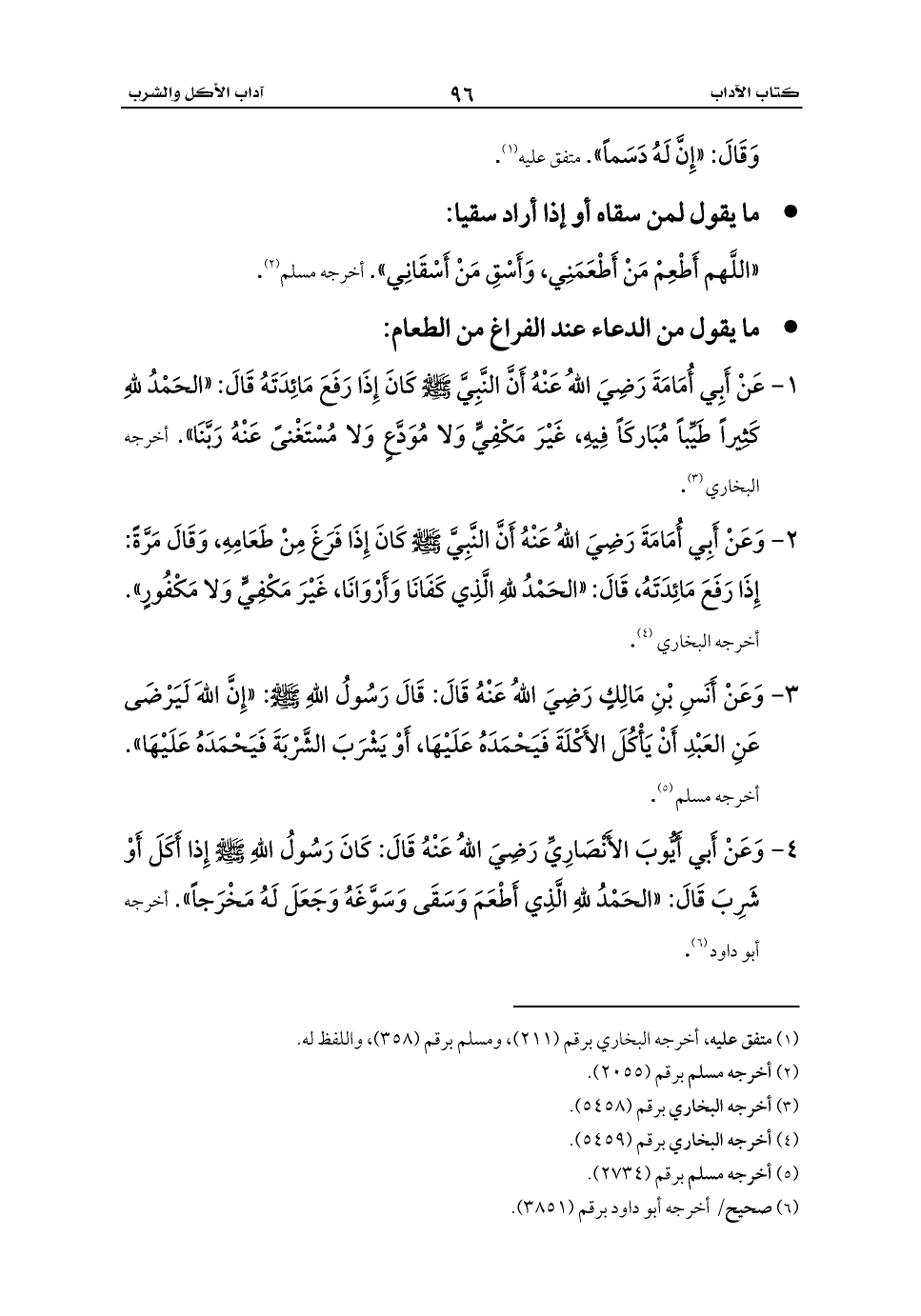 1 - عَنْ أَبِي أُمَامَةَ رَضِيَ اللهُ عَنْهُ أَنَّ النَّبِيَّ - صلى الله عليه وسلم - كَانَ إِذَا رَفَعَ مَائِدَتَهُ قَالَ: «الحَمْدُ للهِ كَثِيراً طَيِّباً مُبَاركَاً فِيهِ، غَيْرَ مَكْفِيٍّ وَلا مُوَدَّعٍ وَلا مُسْتَغْنىً عَنْهُ رَبَّنَا». أخرجه البخاري (¬3).