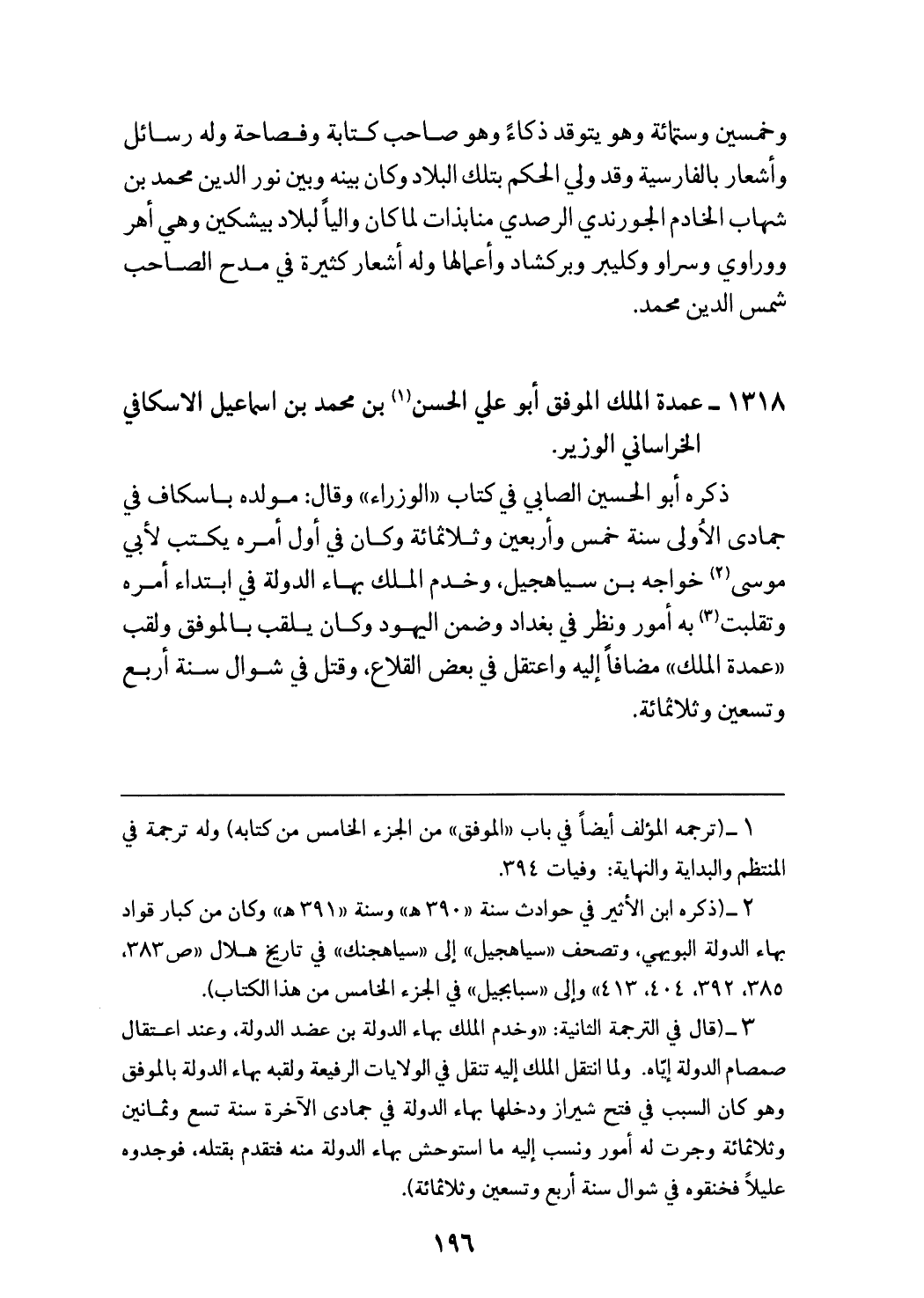 (¬3) (قال في الترجمة الثانية: «وخدم الملك بهاء الدولة بن عضد الدولة، وعند اعتقال صمصام الدولة إيّاه. ولما انتقل الملك إليه تنقل في الولايات الرفيعة ولقبه بهاء الدولة بالموفق وهو كان السبب في فتح شيراز ودخلها بهاء الدولة في جمادى الآخرة سنة تسع وثمانين وثلاثمائة وجرت له أمور ونسب إليه ما استوحش بهاء الدولة منه فتقدم بقتله، فوجدوه عليلا فخنقوه في شوال سنة أربع وتسعين وثلاثمائة).